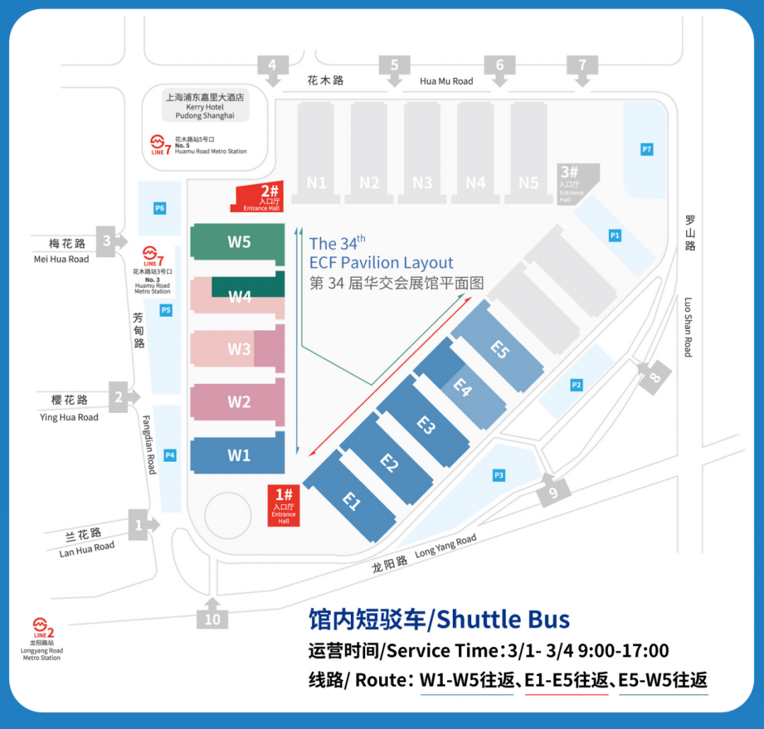 2)搭乘2号线至龙阳路站,步行约10分钟至1号入口大厅入场(近E1馆)。