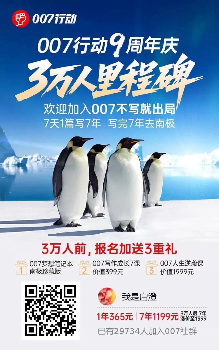 🫡007创始人覃杰老师,用自己对写作的热爱,及宽广的成就他人的托举之心,让有写作热爱的人汇聚在“007不写就出局,7天写一篇,写满7年去南极”。