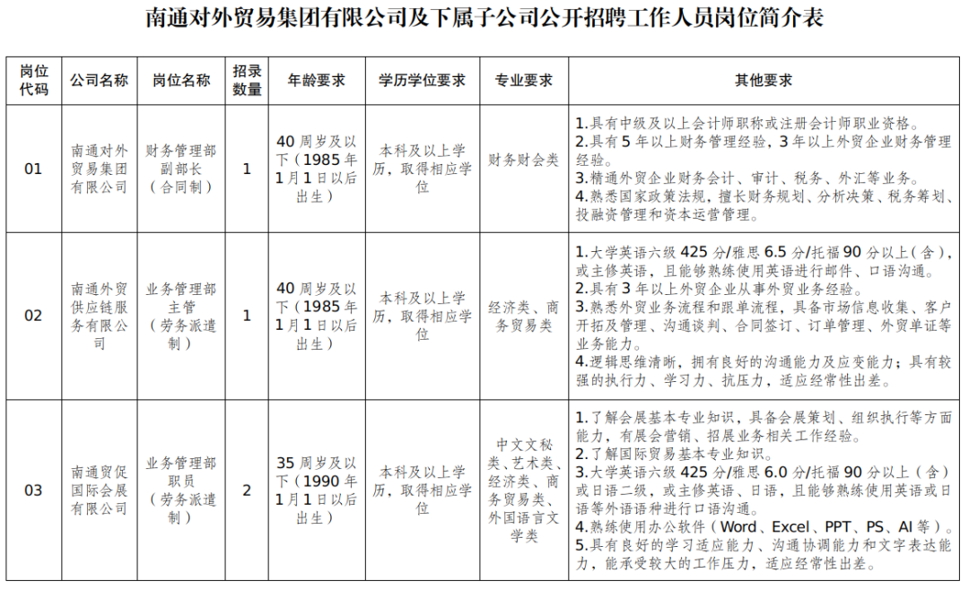 详见《南通对外贸易集团有限公司及下属子公司公开招聘工作人员岗位简介表》(附件1,以下简称《岗位简介表》)。