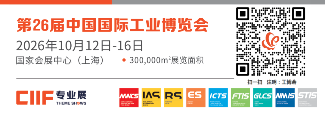 CIIF2026年第26届中国国际工业博览会将于2026年10月12日-16日在国家会展中心(上海)举办,规划展示面积超过30万平方米,9大专业展:MWCS数控机床与金属加工展、IAS工业自动化展、EIAS工业节能环保技术与配套设备展、ICTS工业新一代信息技术与应用展(IIS工业互联网展)、ES能源技术与设备展、新能源与智能网联汽车展、RS机器人展、STIS科技创新展和NMIS新材料产业展,届时将有数十场高质量的高峰论坛及活动同期举行。