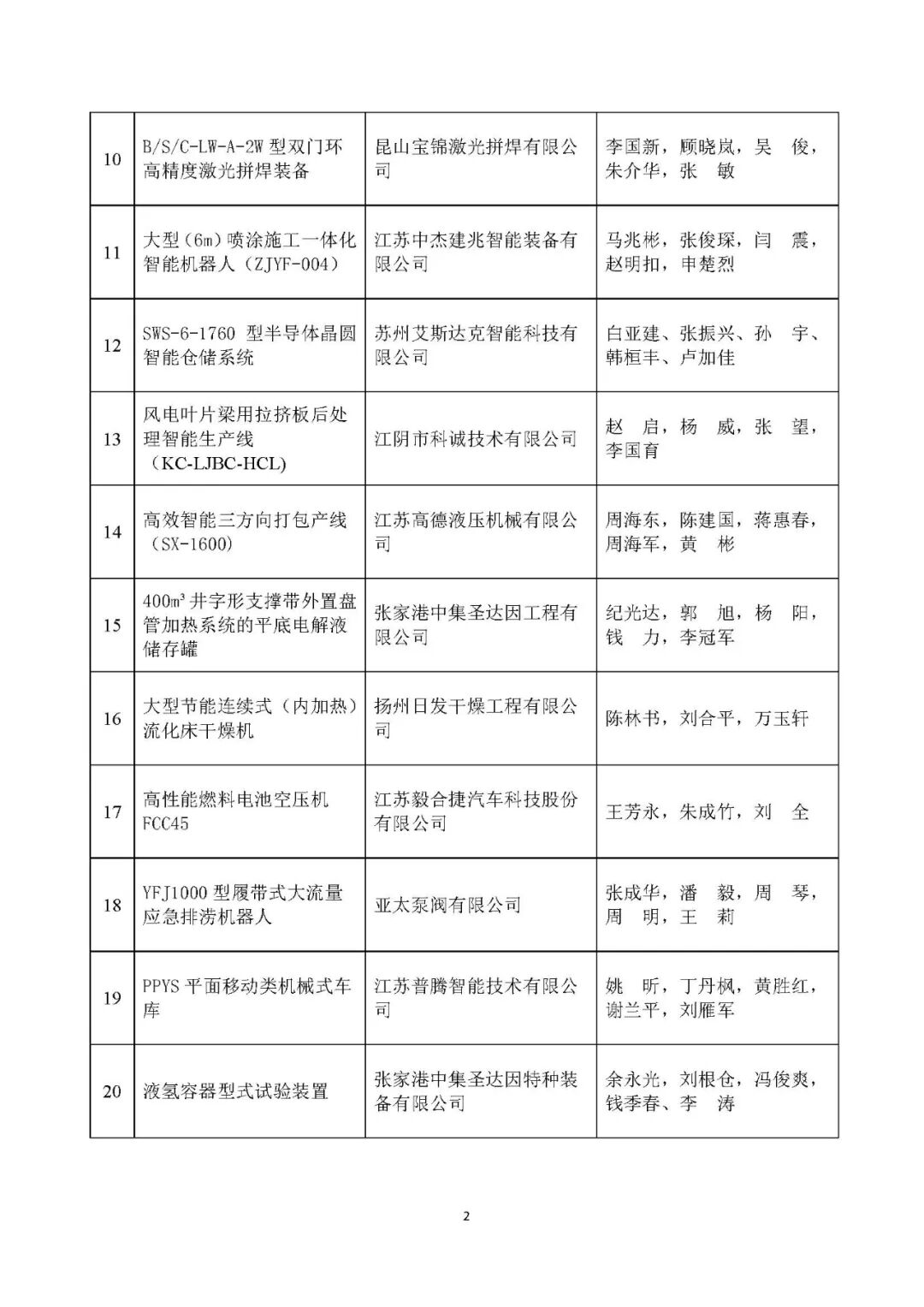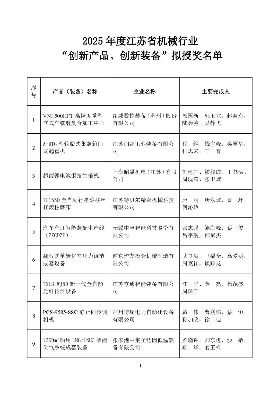 附件:2025年度江苏省机械行业“创新产品、创新装备”拟授奖名单