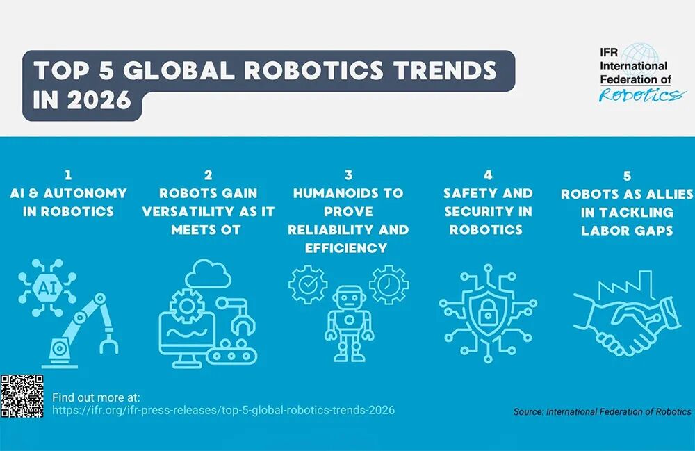 这家总部位于德国法兰克福的机构预测,未来需求将由一系列技术创新、市场力量和新兴业务领域共同推动。以下是IFR为2026年机器人行业识别出的五大趋势: