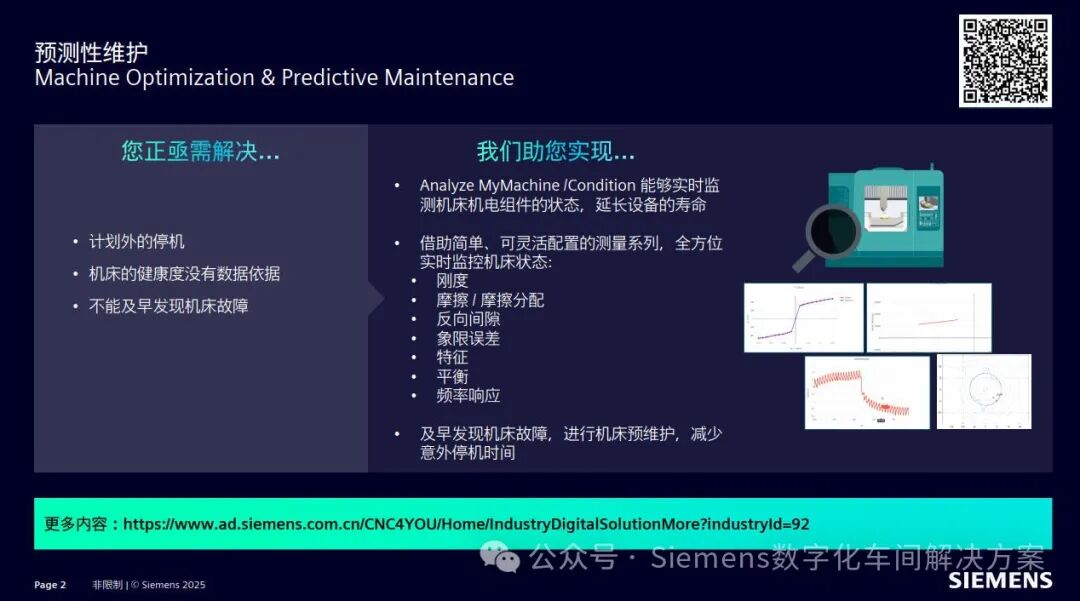 西门子Analyze MyMachine /Condition是一款机床状态监控分析软件。借助简单,可配置的测量设置,可以获取最多7种机床机械指纹数据,进而全方位监控机床机电状态。通过数据的记录以及对比,及早发现潜在偏差以及异常情况。减少计划外的设备停机时间。减少停机时间成本。