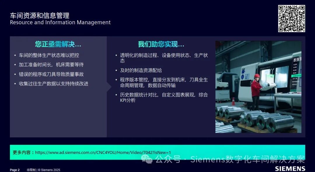 西门子Mcenter是为数控机加车间带来高效的制造资源和信息管理平台,是连接信息化上层和物理制造现场的纽带。通过将生产运营信息和工艺技术信息相关联,有效实现了现场制造资源的配给和信息交互,制造资源包括刀具、程序、材料等。同时Mcenter从机床和其他制造终端获取数据,可进行数据的传递、汇总、统计和分析,从而透明化整个制造流程,实现降本、提效、防错,推动制造企业迈向新高度。