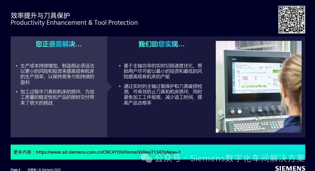西门子Adaptive Control & Tool Monitor 是一款基于主轴负载实时自动调整切削进给速度和监控刀具健康状态的软件。它可以实时进行切削速度优化,帮助用户尽可能以最小的投资和最低的风险提高现有机床的产能 ;通过实时的主轴过载保护和刀具破损检测,可有效防止刀具和机床损坏,同时避免加工工件报废,减少返工时间,提高产品合格率。