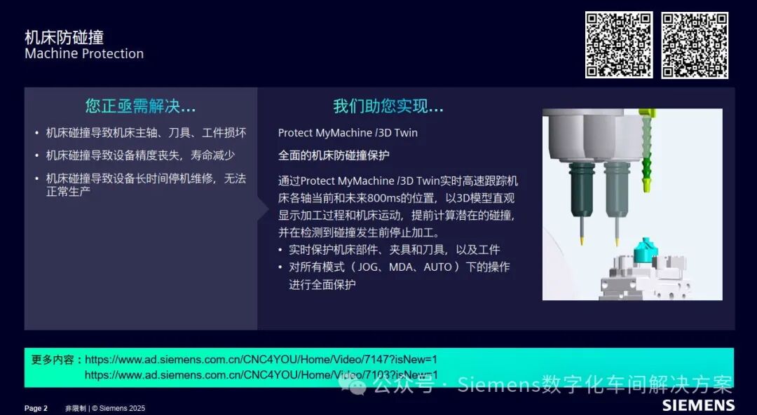 西门子Protect MyMachiine /3D Twin ,该产品实现全面的机床防碰撞保护。通过实时高速跟踪机床各轴当前和未来800ms的位置,以3D模型直观展示加工过程和机床运动,提前计算潜在的碰撞,并在检测到碰撞f发生前停止加工。实现实时保护机床部件,夹具和刀具以及工件;并对所有模式(JOG,MDA,AUTO)下的操作进行全面保护。