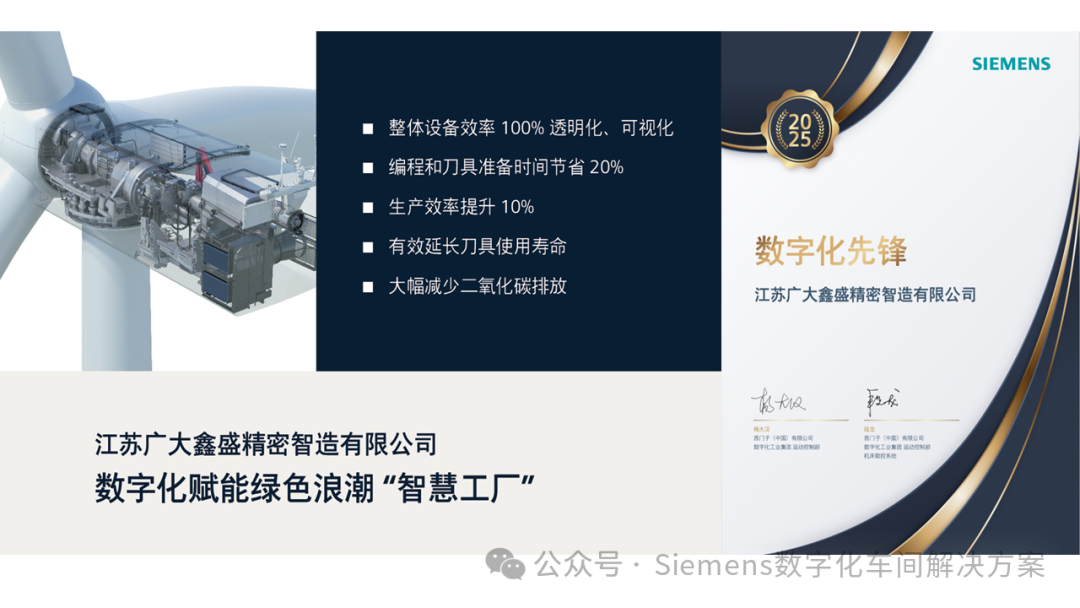 特别值得一提的是,在本次展会上,我们非常荣幸地为江苏广大鑫盛精密智造有限公司颁发了“数字化先锋”荣誉。广大鑫盛作为风电行业的领军企业,通过与西门子的深度合作,成功应用了资源信息管理平台(Mcenter)和自适应控制系统(ACM),显著提升了生产效率和产品质量,为行业树立了数字化转型的标杆。我们衷心感谢广大鑫盛对西门子的信任与支持,期待未来继续深化合作,共同推动风电行业的数字化发展。