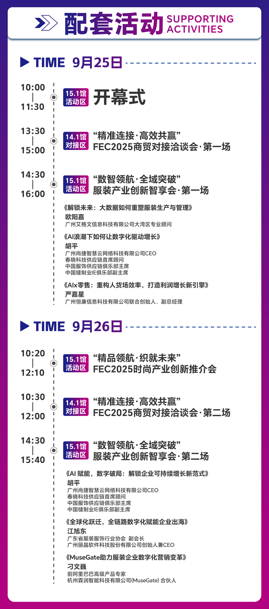 作为服装人年度必逛展会,本届服博会深入推动产业交流,促进供需精准匹配。来这里,捕捉最新市场风向,挖掘优质供应商,抢先机、拓商机!无论您是来找创意灵感,还是拓展合作人脉,FEC2025广州服博会统统为您“配齐”!