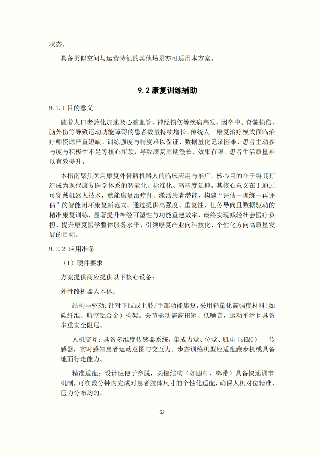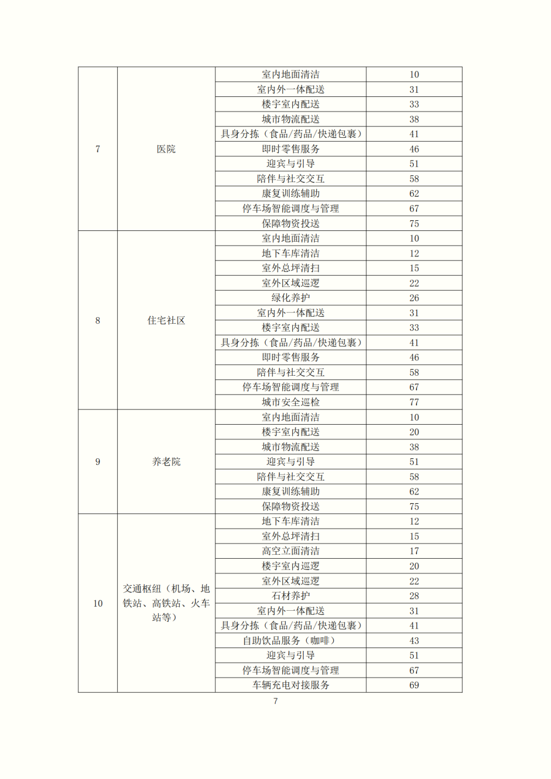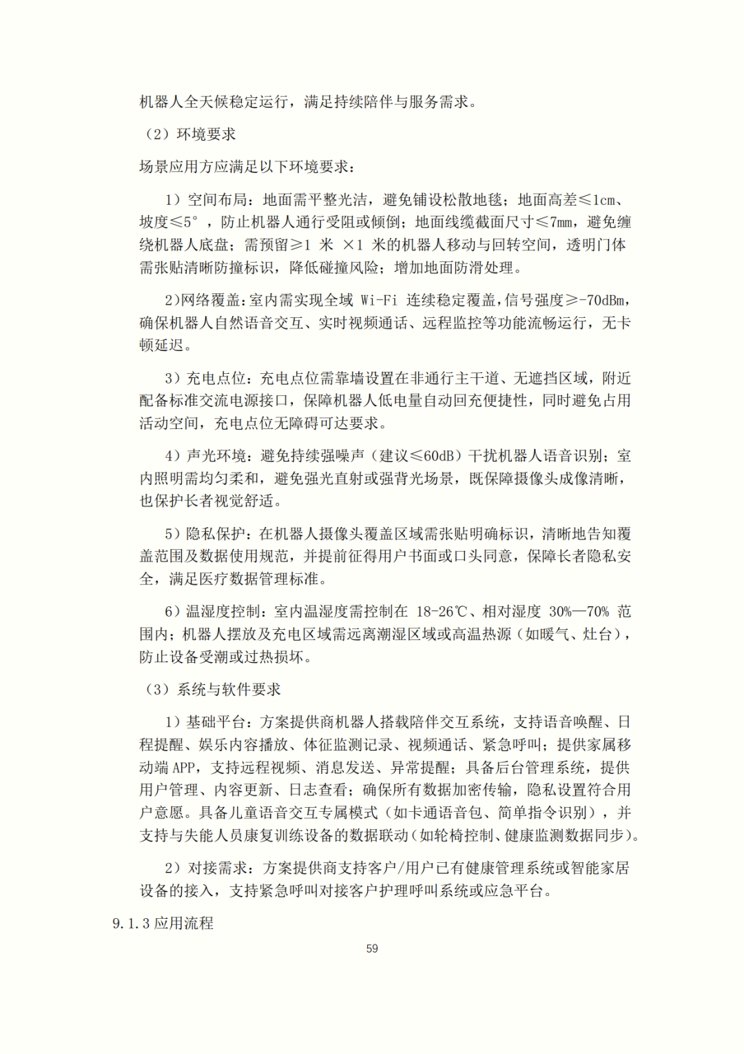 在具体场景方面,指南详细阐述了环境清洁(室内地面、地下车库、室外总坪、高空立面)、安全巡检(楼宇室内巡逻、室外区域巡逻)、设施养护(绿化、石材)、物流配送(室内外一体、楼宇室内、工厂物料搬运、城市物流)、零售服务(具身分拣、自助饮品、即时零售)、导览接待(迎宾引导、讲解导览)、康养陪护(陪伴社交交互、康复训练辅助)、智慧停车(停车场智能调度、车辆充电对接)、城市保障(灾情侦察与保障、保障物资投送、城市安全巡检)等场景的目的意义、应用准备(硬件、环境、系统与软件要求)、应用流程、预期成果及适用空间类型,强调数据安全、优先采用国产大模型、机器人需符合相关标准并通过第三方检测认证。