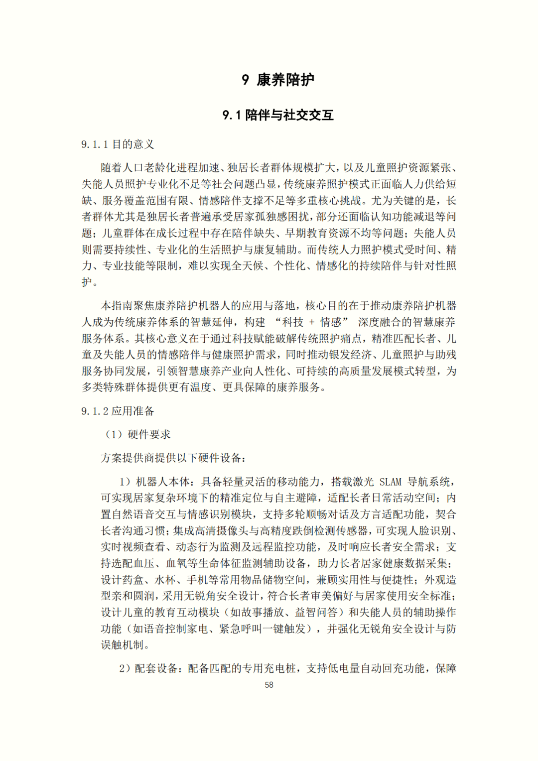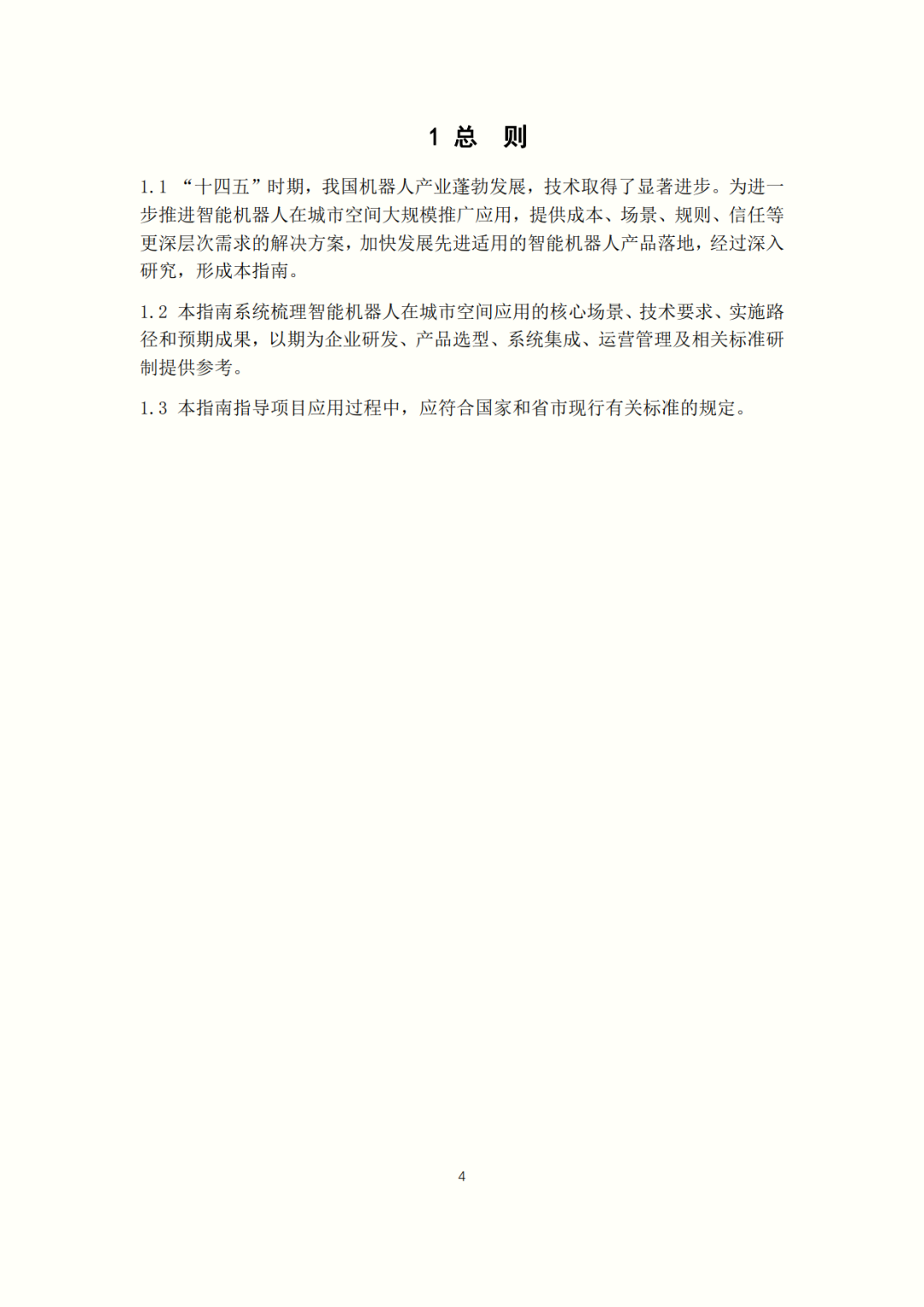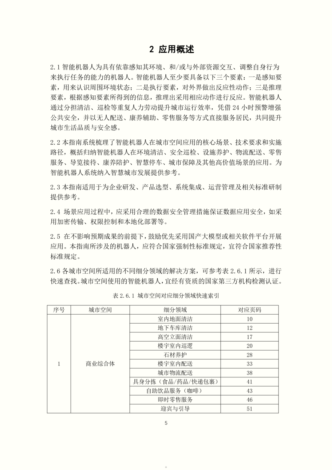 指南系统梳理智能机器人在城市空间的核心场景、技术要求、实施路径与预期成果,明确其作为具备感知、执行、推理三要素的智能体,可通过分担重复劳动、24小时预警、无人配送、康养辅助等方式提升城市运行效率与生活品质。内容涵盖总则、应用概述、环境清洁、安全巡检、设施养护、物流配送、零售服务、导览接待、康养陪护、智慧停车、城市保障共11章,覆盖商业综合体、写字楼、公寓、会展中心、酒店、学校、医院、住宅社区、养老院、交通枢纽、产业园区、工厂、物流仓储中心、市政公共空间等14类城市空间及其细分领域,并附快速索引表便于查找。