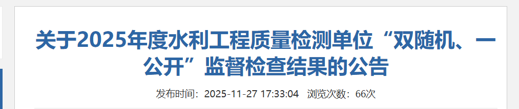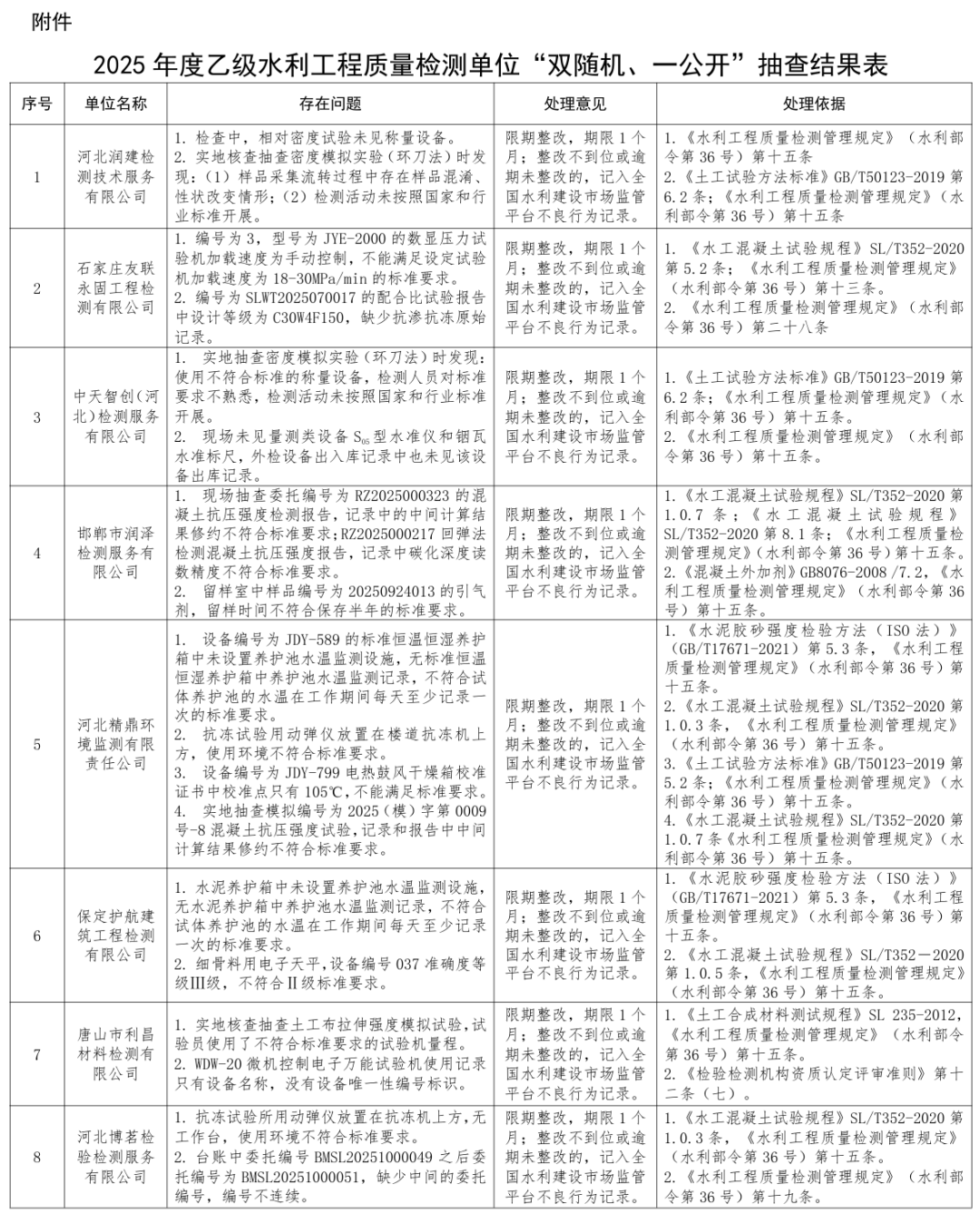 按照《关于开展2025年度水利工程质量检测单位“双随机、一公开”监督检查的通知》(冀水建〔2025〕24号)要求,我厅开展了2025年度乙级水利工程质量检测单位“双随机、一公开”抽查检查工作,现将结果予以公布。