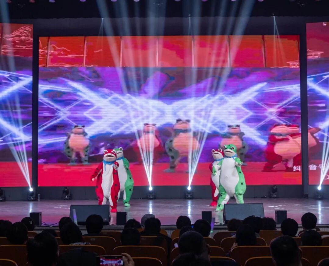 刚刚入职鹏宇的机电一体化专业学子化身灵动“卡通蛙”,创意演绎《龙腾蛙跳》。趣味编排中蕴藏校企协作的深意,活泼表演尽显青春风采。