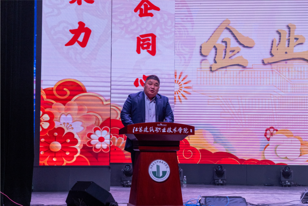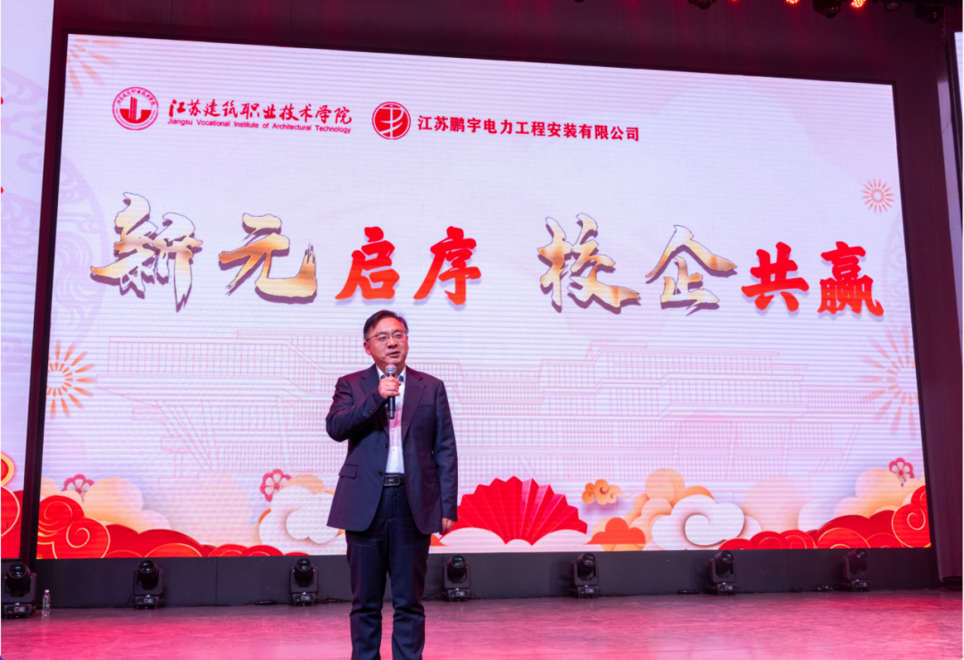 江苏鹏宇电力工程安装有限公司总经理王鹏登台送祝福,祝愿校企合作之路越走越宽广,携手开创共赢新局面。