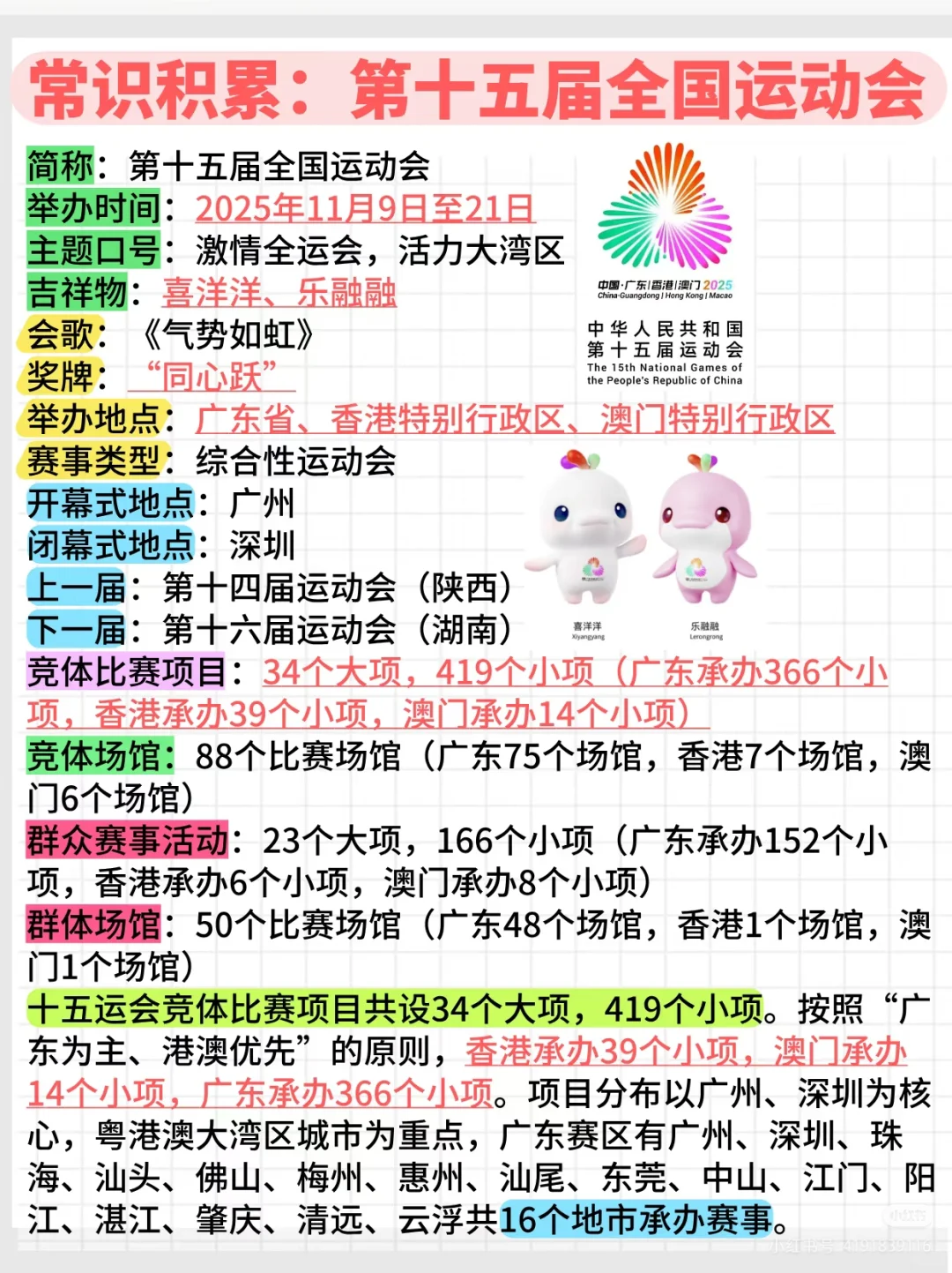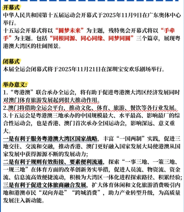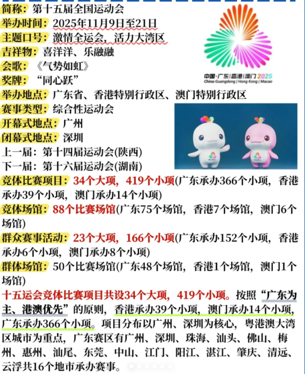 中国第十五届全国运动会终于要来了!2025年11月9日-21日,第十五届全国运动会在广东、香港、澳门举办。关键时间线 - 举办时间:2025年11月9日-21日 -划重点:部分赛事已经提前开赛,全运热度持续升温中