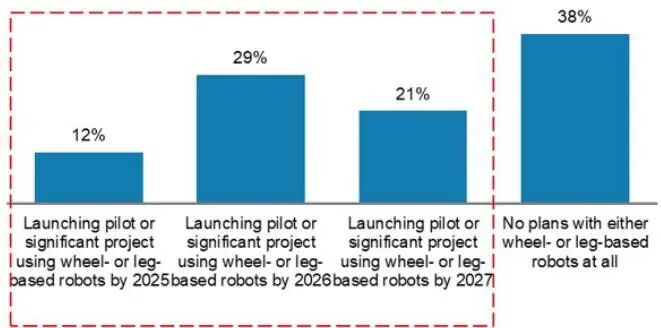 根据AlphaWise的调查,尽管目前人形机器人的采用率还很低,但企业部署意愿强烈。62%的受访企业表示有计划在2025-2027年间部署轮式或腿式人形机器人项目 。这一强烈的采用意愿为行业的快速验证和初步采用提供了支持 。