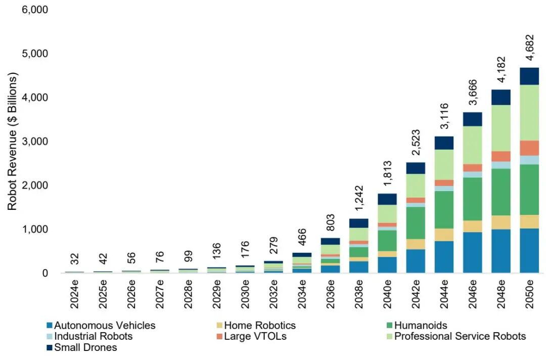 报告预测,到2050年,全球机器人市场规模将达到25万亿美元,其中中国市场将占据5万亿美元 。人形机器人作为一个重要分支,其全球市场规模到2050年预计可达7.5万亿美元,其中中国市场约占1万亿美元 。