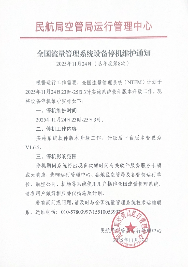 根据运行工作需要,全国流量管理系统(NTFM)计划于2025年11月24日23:00至25日3时实施系统软件版本升级工作。现将设备停机维护安排如下: