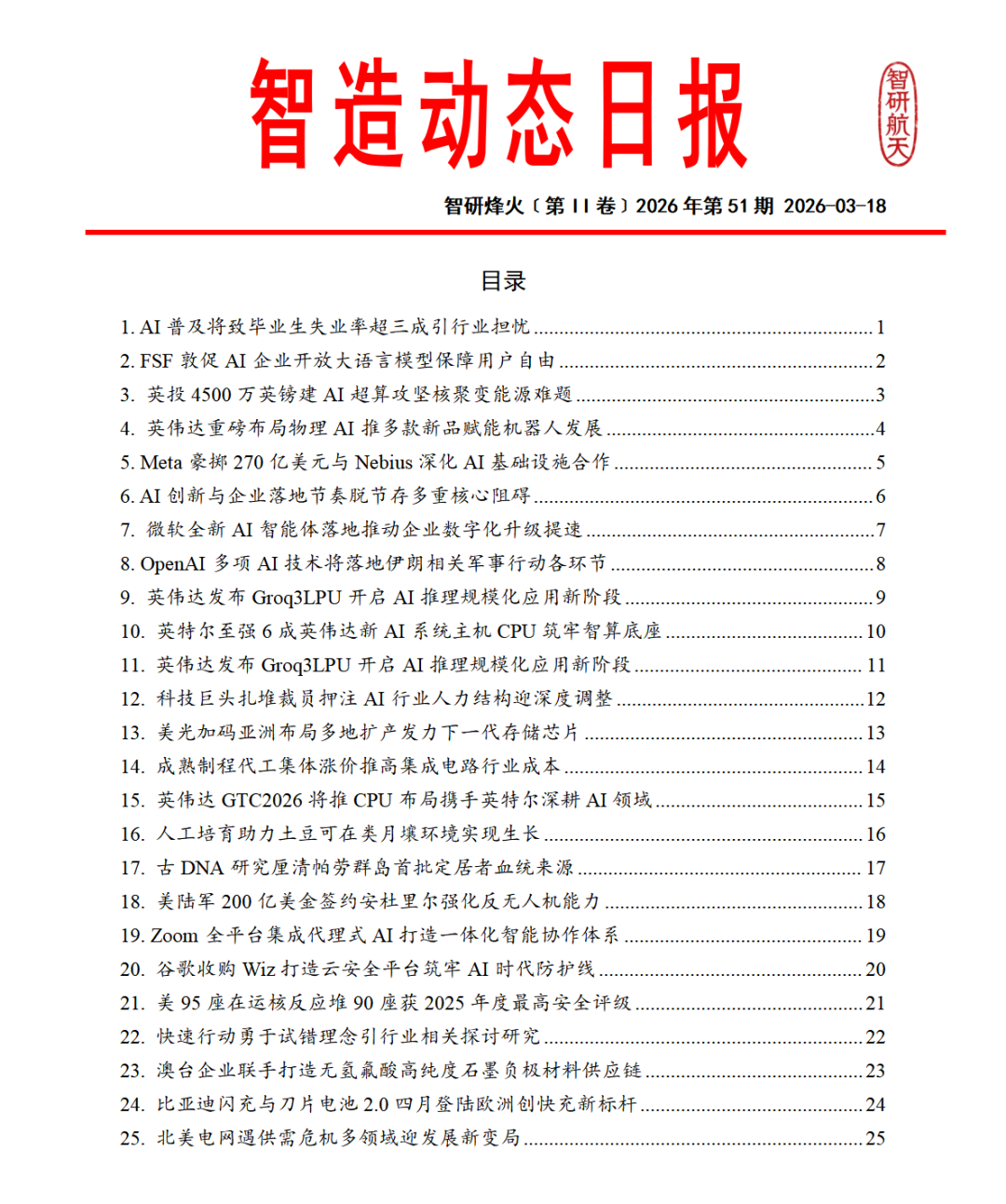 聚焦全球智能制造领域的权威情报产品,每日精选航空技术与应用、人工智能、工业机器人、增材制造、芯片工艺等核心技术突破与产业动态,以结构化、可编辑的文档形式呈现。内容涵盖技术解析、企业战略及政策影响,依托资深专家团队及强大的开源情报处理能力,助力企业快速捕捉技术趋势与市场机遇,把握智造脉搏,引领产业升级。