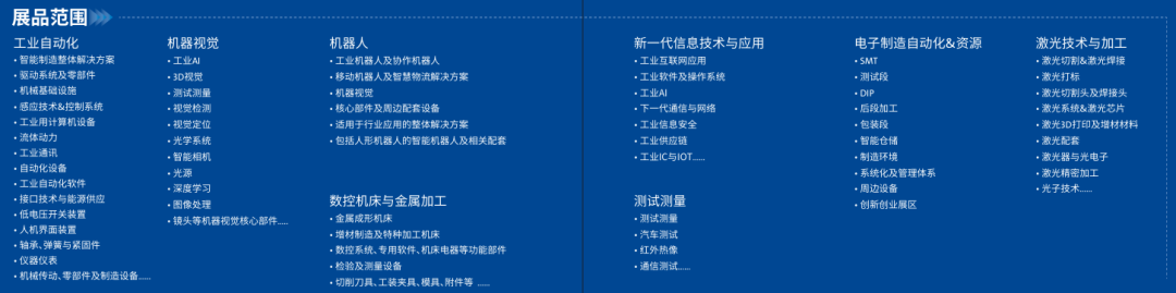 本届展会深度整合工业生态核心板块,重磅推出:工业自动化展、机器视觉展、激光技术展、数控机床与金属加工展、机器人展、新一代信息技术与应用展、工业互联网展、测试测量展、CMM电子制造自动化&资源展在内的八大主题展区,以"纵向深化、横向贯通、立体呈现"三大维度重构工业展会新范式:纵向聚焦各细分领域最前沿技术突破,横向构建跨领域协同创新的产业生态,立体化呈现从单点技术到系统解决方案的全维度创新图谱,以专业深度赋能产业升级,以创新广度驱动智造未来,打造工业技术发展的风向标。
