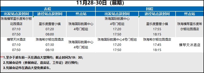 另外,展会主办方还贴心的为入住指定接待酒店的展商、嘉宾安排了酒店免费穿梭巴士,展商、宾可凭展会证件在指定接待酒店前台登记预约,乘坐酒店免费穿梭巴士往返航展中心4号门