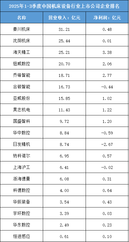根据东财行业分类,2025年1-3季度中国机床设备行业上市公司企业排名如下:(A股上市公司)