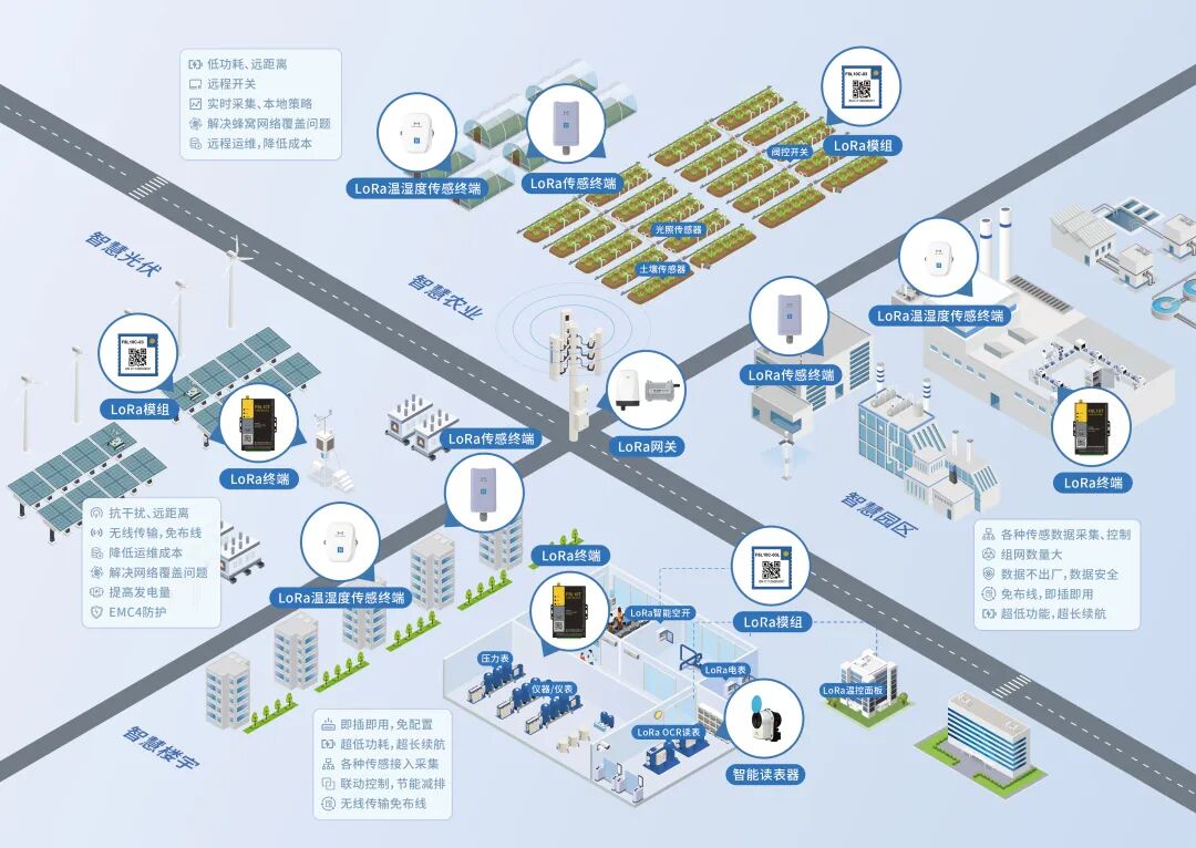 方案构建了模组 - 终端 - 网关 - 平台的完整产品生态,涵盖LoRa传感器终端、LoRaWAN室内/工业级基站、LoRa网关等核心硬件,搭配专属LoRa网络管理系统,实现千米级无线数据传输,零丢包稳定通信,完美适配矿山、化工、建材、大型制造基地等复杂工业场景。