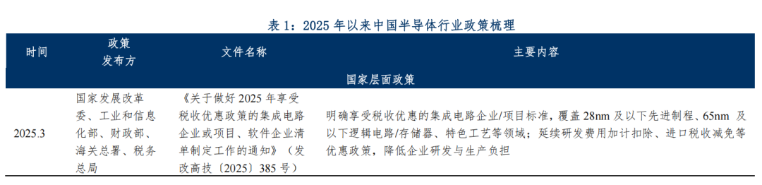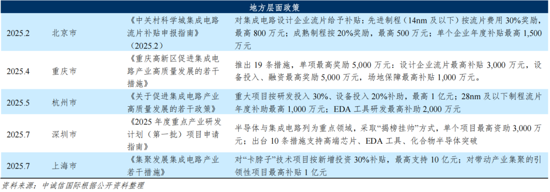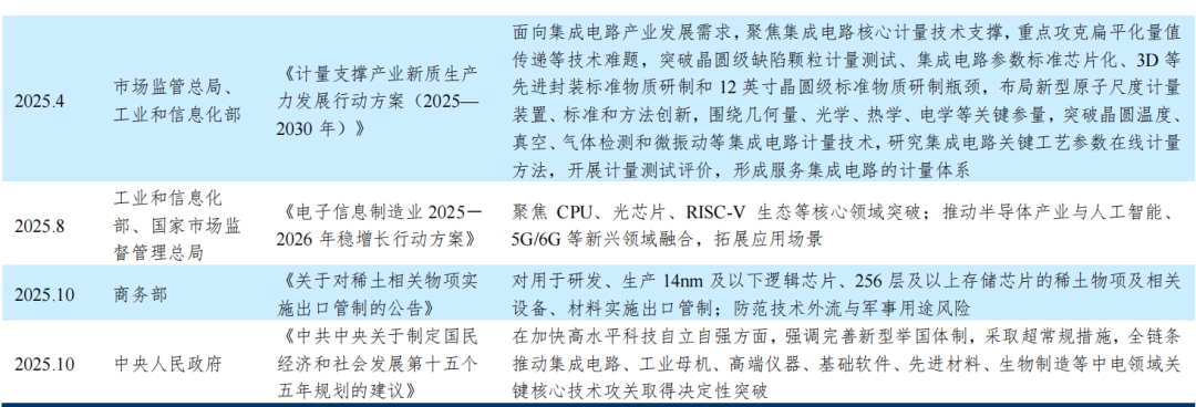 国内政策方面,2025年以来,我国半导体产业支持政策延续了“自主可控、高端突破、全链协同”的核心导向,构建国家顶层设计与地方精准配套、财税金融赋能与技术攻关驱动、产业安全保障与创新生态培育相结合的全方位政策体系。国家层面,以《集成电路产业高质量发展实施方案(2025~2027年)》等纲领性文件为引领,定向支持高端芯片、光刻机、EDA工具、大硅片等“卡脖子”环节攻关。资金方面,国家集成电路产业投资基金三期、人工智能产业投资基金等为产业发展提供资本支持,通过研发费用加计扣除比例提升、阶梯式企业所得税减免、增值税加计抵减等财税优惠降低企业研发生产负担,出台半导体设备国产化推进方案、产业链供应链协同发展行动计划及计量支撑产业新质生产力发展行动方案等专项应用补贴。产业链方面,完善半导体材料与设备质量认证体系,强化芯片设计、制造、封测等全环节联动以应对海外供应链波动风险,同时实施稀土相关物项出口管制,保障产业安全。地方层面,各省市政府在国家政策引导下,结合当地产业基础出台一系列专项政策以扶持半导体产业发展,相对于国家顶层设计,地方政策更多集中在产业引进、资金补贴,人才引进等方面。资本市场方面,证监会并购重组机制改革、“并购六条”及配套措施等国家级核心政策支持“硬科技”领域通过并购重组做大做强,设立快速并购通道、加快审核节奏,为半导体企业并购创新资产提供便利。与此同时,股权融资端,国家监管层面通过完善科技企业上市、再融资、并购、基金等多元渠道,为其提供全生命周期股权融资支持,聚焦硬科技与产业链安全。债券市场则发布了《关于推出科技创新债券构建债市“科技板”的通知》等系列文件,解决中小规模硬科技企业融资痛点。此外,根据2025年10月发布的《中共中央关于制定国民经济和社会发展第十五个五年规划的建议》,“十五五”规划建议提出全链条推动集成电路领域关键核心技术攻关,加快实现高水平科技自立自强,进一步将半导体产业提升至支撑国家科技安全、引领新质生产力发展的战略高度。