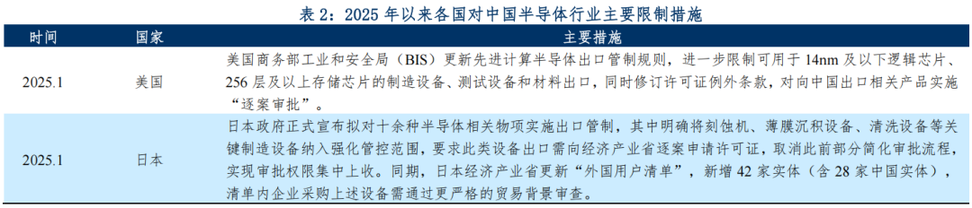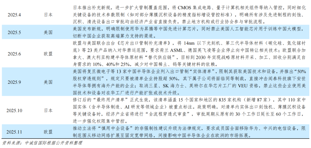 国际环境方面,近年来,美国、日本、欧盟等发达区域国家,持续针对我国半导体产业实施一系列限制措施,以遏制中国在先进制程芯片、人工智能算力芯片等领域的突破,覆盖设备出口、技术授权、供应链管控、市场准入等全产业链环节。2025年以来,这些限制措施覆盖范围进一步扩大,规则也逐步细化,严格限制了我国企业获取先进技术与高端算力的渠道,削弱我国成熟制程芯片的材料供应稳定性及产能供给能力,并通过限制我国半导体企业在全球范围内市场拓展以冲击拥有海外产能布局的半导体企业。