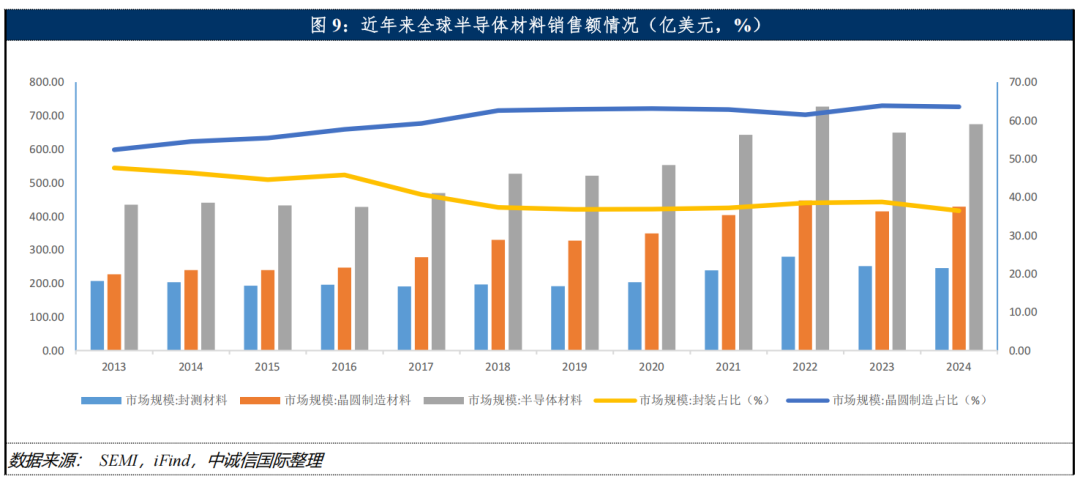 半导体材料细分种类极多,从用途上可分为晶圆制造材料和封装材料两大种类,其中晶圆制造材料占比超过60%。根据相关数据显示,2025年中国大陆半导体材料市场规模达1,500亿元人民币,占全球市场约28%,连续4年位居全球第一大半导体材料消费市场。从全球竞争格局来看,半导体材料产业内各细分品种市场集中度均处于较高水平,产业主要由日本主导,多个细分领域头部企业均为日本企业,根据思瀚产业研究院、观知海内咨询等机构数据,硅片全球市场前六大企业市场份额超90%,光刻胶全球市场前五大企业市场份额约90%,CMP材料全球市场前十大企业市场份额超80%。经过多年培育,目前我国在部分领域已实现较大突破,部分产品技术标准达到国际一流水平,如硅片、CMP抛光液、湿电子化学品等,但光刻胶相关领域市场份额仍较低,且存在一定技术差距。