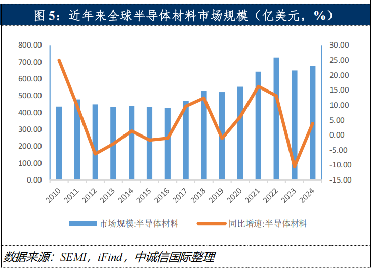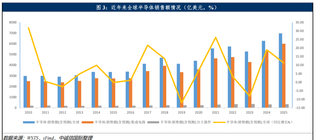 受供需关系波动、技术迭代节奏、终端需求变化及宏观经济环境等多重因素影响,半导体行业具有较为典型的周期性行业特点,呈现“繁荣-衰退-复苏-再繁荣”的循环特征,历史上平均周期长度约3~4年。根据世界半导体贸易统计组织(WSTS)数据,2025年全球半导体销售额达6,971.84亿美元,同比增长11.22%,其中集成电路销售额6,000.69亿美元,同比增长12.27%,分立器件销售额333.77亿美元,同比增长5.80%。半导体设备方面,根据国际半导体产业协会(SEMI)发布数据,2025年全球半导体制造设备总销售额达到1,330亿美元,同比增长13.81%,创历史新高。半导体材料方面,根据TECHCET机构统计数据,2025年全球半导体材料市场总规模达到约700亿美元,同比增长6% 。整体来看,2025年,全球半导体行业在经历上一轮衰退后,进入新一轮复苏周期。