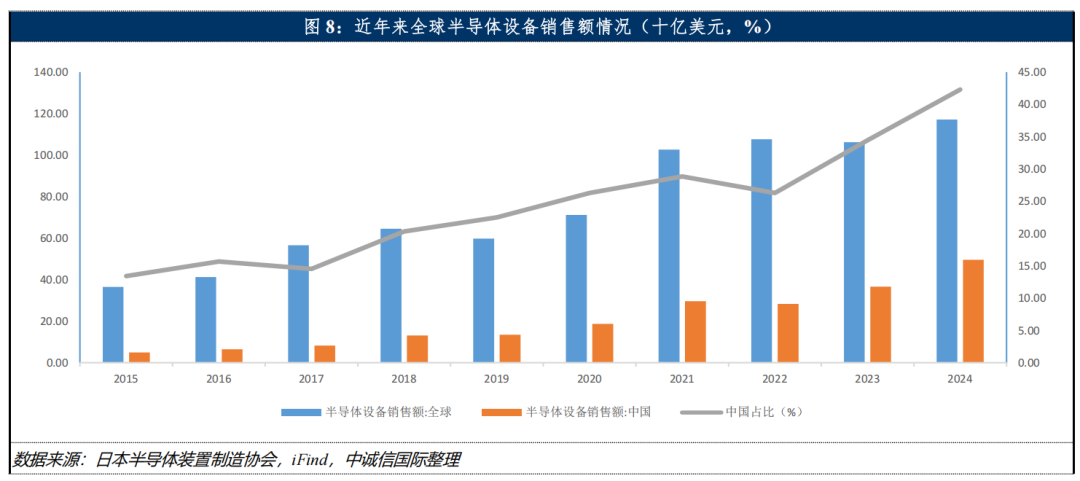 作为支撑芯片设计、制造、封测全产业链运转的核心生产载体,半导体设备承担着电路图案转移、材料刻蚀、薄膜沉积、性能检测等关键工序的实施功能,半导体设备零部件涉及种类繁多、工艺复杂且精细度要求极高,专利及客户认证壁垒高,多年来市场竞争格局相对稳定且为寡头垄断,全球头部企业主要集中于美国、日本及荷兰,以美国应用材料、荷兰阿斯麦、美国泛林集团、日本东京电子等为各环节设备代表企业。近年来我国持续加大半导体产业投资力度,目前已是半导体设备最大的需求方,国内半导体设备销售额占全球销售额比重已经超过40% ,但与巨大的市场需求相比,我国在半导体设备上的生产能力与头部企业仍有较大差距,经过多年产业政策及资金支持,我国半导体设备企业在成熟制程方面已经有较高的国产化替代率,但在光刻胶、离子注入机等环节设备国产化率仍然极低。尽管我国半导体设备厂商在成熟制程方面已经取得一定成绩,但与全球最先进相比,从制程角度来看,目前世界半导体设备研发水平处于2nm及更先进制程,生产水平最高则已经达到3nm量产,与之相比,国内半导体设备在各环节基本还存在1-2代产品差距。