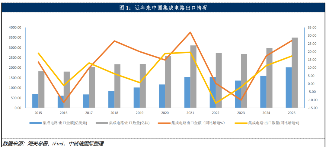 从需求端来看,半导体是电子信息产业的核心基石,应用领域覆盖消费电子、汽车电子、通信与网络、医疗电子、国防军工、人工智能和工业控制等几乎所有电子设备及新兴产业赛道。消费电子是过去十年半导体的主要应用领域,2025年消费电子市场呈现温和复苏态势,智能手机方面,在经历多年高速增长后,智能手机进入较为稳定的存量市场阶段,根据Omdia数据,2025年全球智能手机出货量增长2%,达到12.5亿部,为2021年以来的最高水平,但增速显著放缓;PC方面,根据Omdia数据,2025年全球PC出货量2.795亿台,同比增长9.2%。汽车电子方面,随着新能源汽车快速发展,车载电子相关部件覆盖车用功率半导体、传感器、计算芯片、智能驾驶、智能座舱、动力控制系统等多个方面,单车半导体需求较传统油车大幅提升,根据乘联会数据,2025年全球新能源汽车销量约2,280万辆,同比增长28.5% ,市场渗透率提升至24.8%,其中汽车电子部分,根据Mordor Intelligence数据,汽车半导体市场规模在2025年达到1,004.8亿美元,预计以7.29%的复合年增长率扩张,将市场价值提升至2030年的1,428.7亿美元。近年来,生成式AI的出现为人工智能产业带来了巨大发展,而人工智能正从需求端、技术端、供给端等全方位重塑半导体产业,其中对算力的需求极大的推动了对半导体产业的需求,算力需求的增长带动了AI服务器及数据中心的快速发展,其中AI服务主要由AI芯片、存储、连接部件等构成,AI同时推动了这多方面需求并显著提升了每个部件内半导体含量,例如AI服务器芯片价值量是传统服务器的5~10倍,消耗的DRAM存储是普通服务器的8倍,2025年全球半导体销售额达6,971.84亿美元,同比增长11.22%,其中AI芯片占比超过20%,约1,500亿美元,AI服务器出货量同比增长约29% 。国内方面,中国作为全球最大半导体市场,在人工智能及汽车电子带动下,根据同花顺金融数据,2025年中国半导体销售额2,108.8亿美元,同比增长14.68%。近年来,随着各国对我国半导体产业限制范围不断扩大,我国半导体企业在全球范围内市场拓展受到极大影响,以美国为例,禁止企业采购制造地在中国的芯片,从而削弱全球半导体市场复苏对我国半导体产业的带动作用。面对这种局面,我国明确提出“鼓励国内企业优先采用国产集成电路产品和服务”,将半导体纳入战略性新兴产业重点支持领域,聚焦芯片设计、制造、封测、设备、材料等全产业链,重点推动AI芯片、车规级芯片、模拟芯片、存储芯片及半导体设备、关键原材料的国产化替代,为企业采用国产半导体提供明确的政策指引和发展预期;从资金层面,出台多元化财政及税收优惠政策,降低企业采用国产半导体的成本压力,从资金角度提升企业积极性;在市场层面,通过政府采购、应用场景开放、产业链协同等举措,拓宽国产半导体的应用空间;通过这些措施大幅提升我国半导体产业国产化替代程度,在产业链布局逐步完善,特别是在设计、制造及封测等环节实现成熟制程突破背景下,将半导体相关海外需求转移至国内。整体来看,与以往行业复苏周期不同,本轮半导体行业的复苏主要由汽车电子与人工智能两大领域驱动。特别是人工智能的快速发展,正推动半导体从电子产品的关键组件,演进为几乎所有行业的底层基础设施,从而推动全球半导体行业需求的多元化与结构化演进;同时,在半导体国产化替代带动下, 随着国内产业链布局逐步完善,先进技术持续突破,国内半导体海外需求亦将不断转移至国内。
