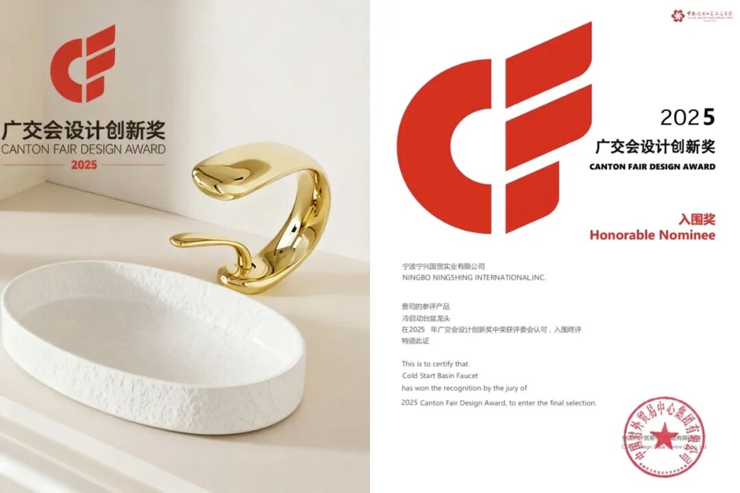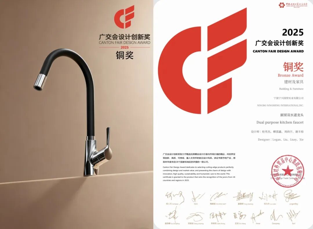 近日,2025年广交会设计创新奖(CF奖)评选结果揭晓,宁兴贸易集团旗下的龙头产品成功斩获两项荣誉,其中“厨房双水道龙头”荣获铜奖,“冷启动台盆龙头”获得入围奖。