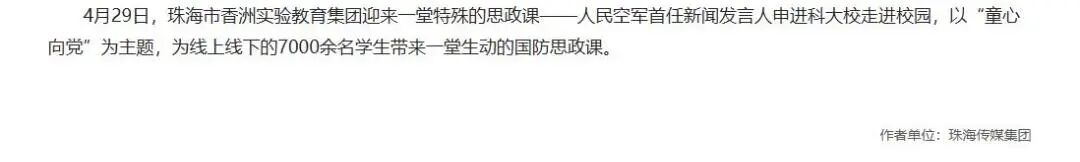 2025年,“香山大思政”暨“大咖进校园”活动在学校持续开展,先后邀请国防教育专家、大国工匠等走进校园,集团7000余名学生同上一堂思政课,被《学习强国》《中国航展》等多家国家级、省市级媒体报道。