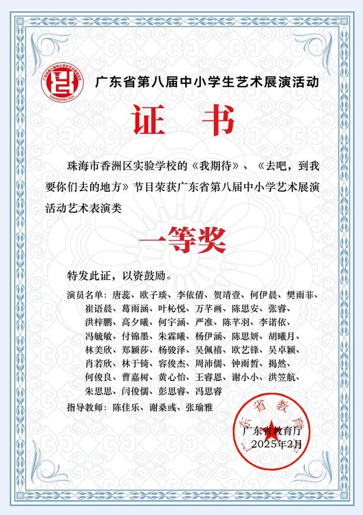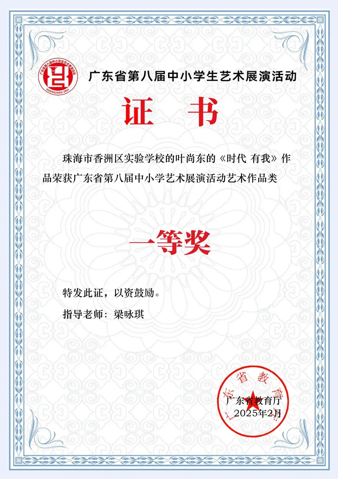 艺术教育成果斐然。学生合唱团荣获广东省第八届中小学生艺术展演合唱一等奖;学生美术作品荣获广东省第八届中小学艺术展演活动艺术作品类一等奖;获省、市、区级艺术类集体奖项4项;获奖学生114人次。