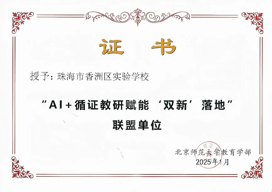 2025年,被北京师范大学教育学部授予全国“AI+循证教研赋能‘双新’落地联盟单位”,成为全国首批获此资质的基础教育单位。