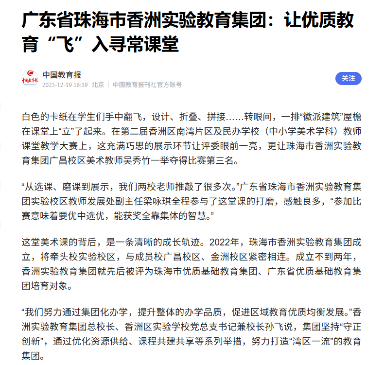 2025年,集团化办学经验被《中国教育报》专题报道,孙飞总校长在“香洲区推进‘百千万工程’暨集团化办学高质量发展研讨会”上做专题经验分享。香洲实验教育集团先后被评为区市级优质教育集团、广东省优质基础教育集团培育对象,为区域教育优质均衡发展提供了可资借鉴的样本。