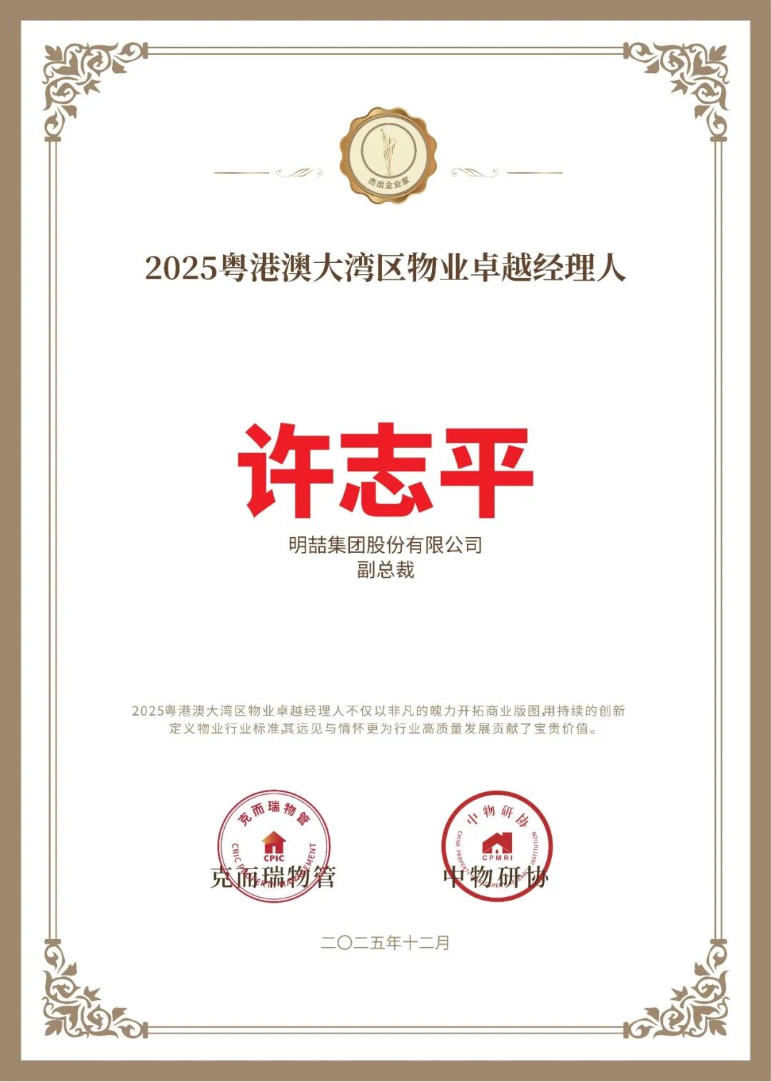 集团副总裁、安技部总经理许志平——2025粤港澳大湾区物业卓越经理人