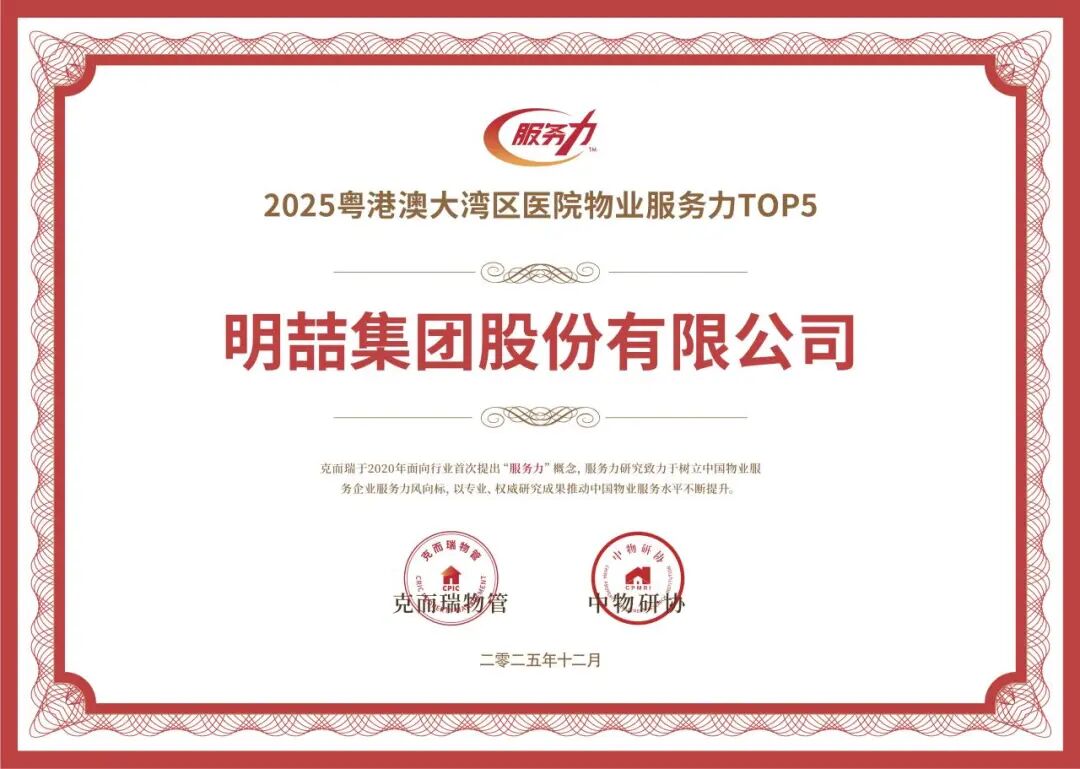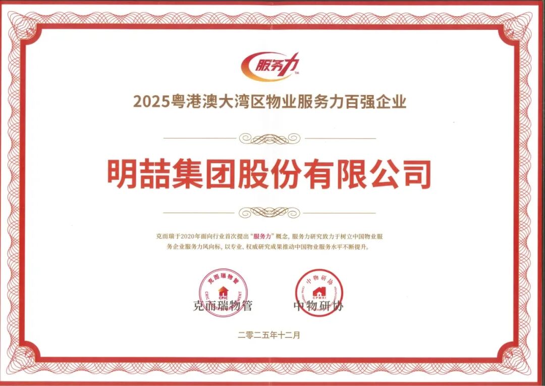荣耀加身,步履不停12月18日,由克而瑞主办的2025粤港澳大湾区物业服务力百强峰会在深圳圆满落幕。峰会聚焦行业前沿,共探服务新篇,为大湾区物业领域注入全新动能。现场,克而瑞物管权威发布《2025粤港澳大湾区物业服务力系列研究成果》,并举行隆重的颁奖典礼,为大湾区物业服务力树立全新标杆。