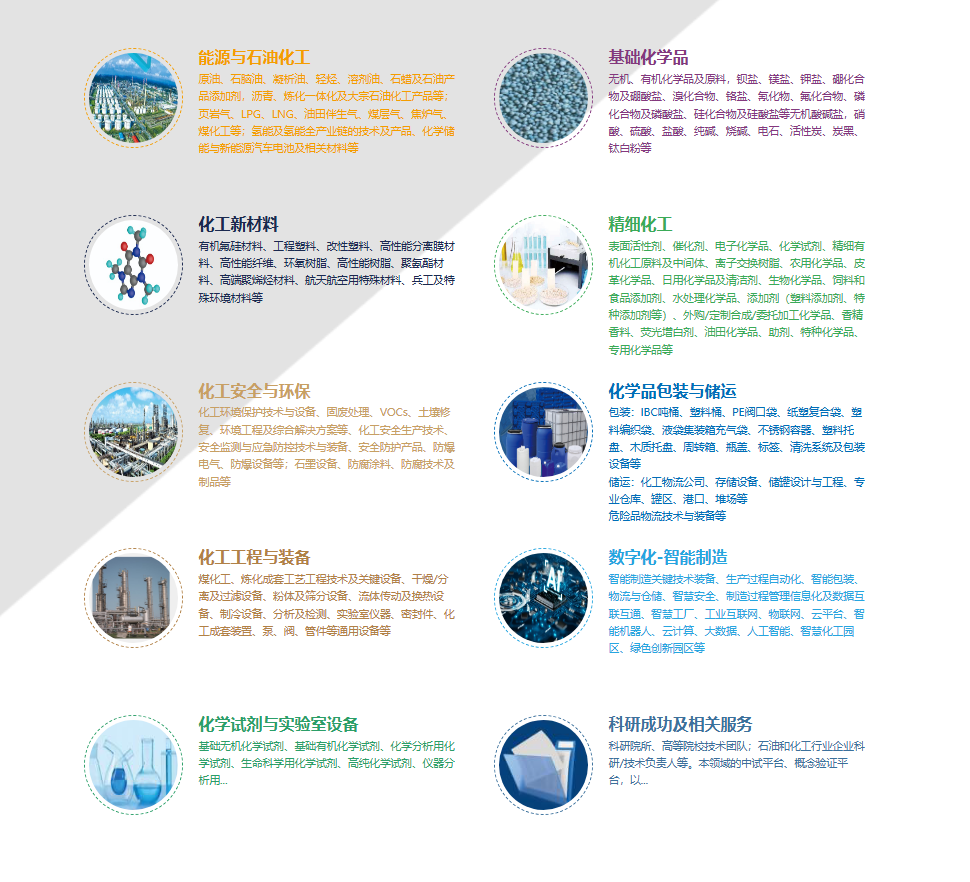 | E4馆 | 能源化工与新材料馆 | 能源与石油化工 化工新材料:高性能聚烯烃、工程塑料、碳纤维、芳纶、氟硅材料 | |