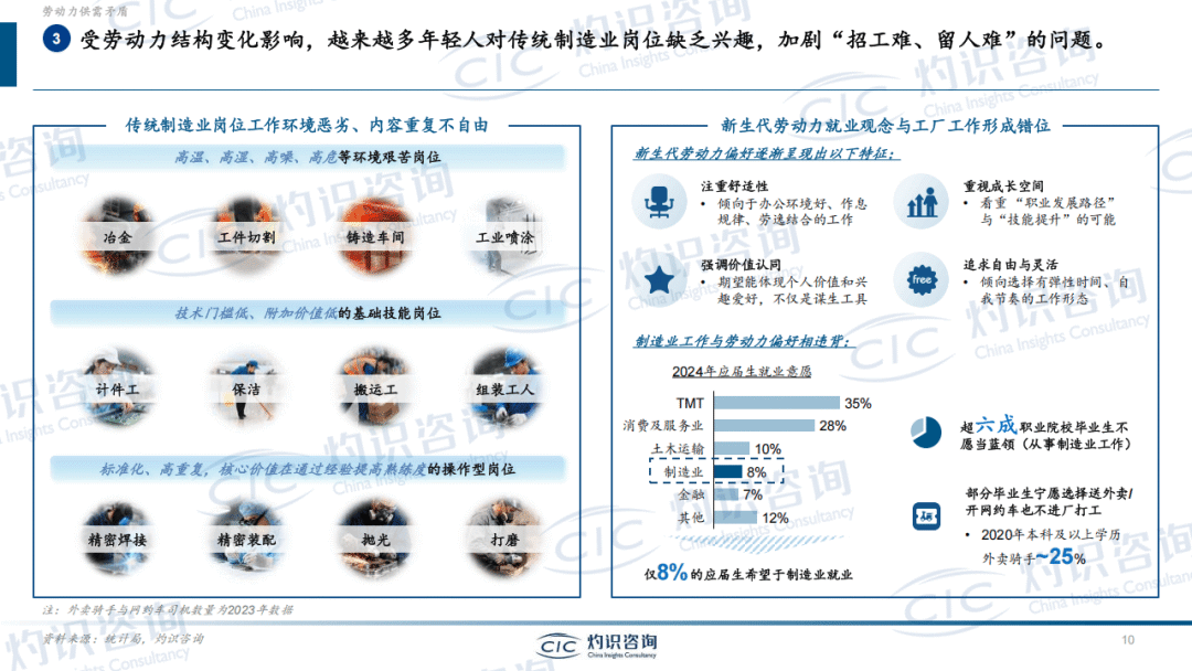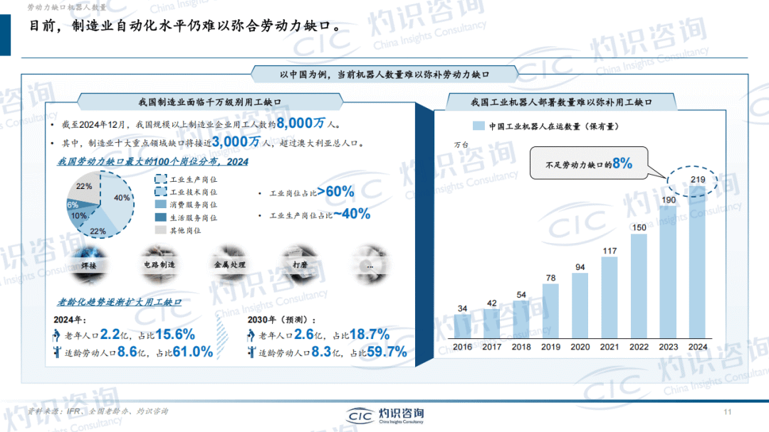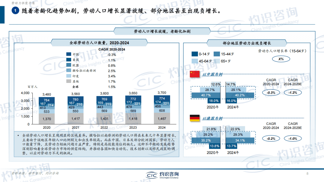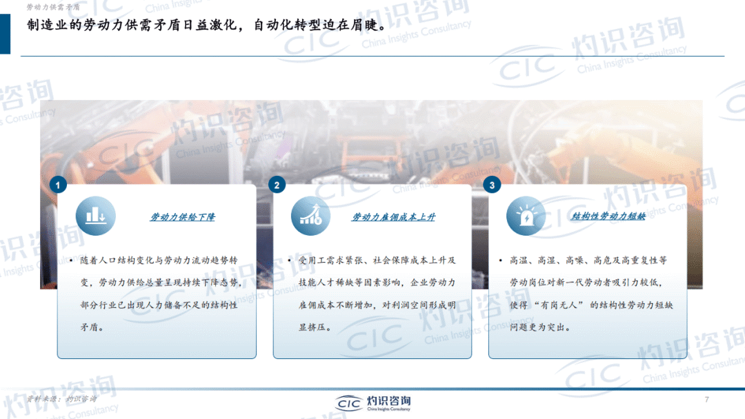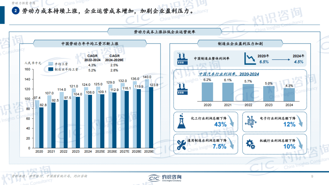 行业发展的核心驱动力来自劳动力供需矛盾。全球劳动力人口增长放缓,中国等主要经济体劳动力总量呈下降态势,2024-2029年中国劳动力人口CAGR为-1.0%。同时,制造业面临千万级别用工缺口,高温、高噪等艰苦岗位招工难问题突出,新生代劳动力就业观念转变,更倾向灵活自由的工作形态,与传统工厂岗位需求形成错位。此外,劳动力成本持续上涨,中国制造业平均工资保持上行趋势,进一步推动企业寻求自动化替代方案。