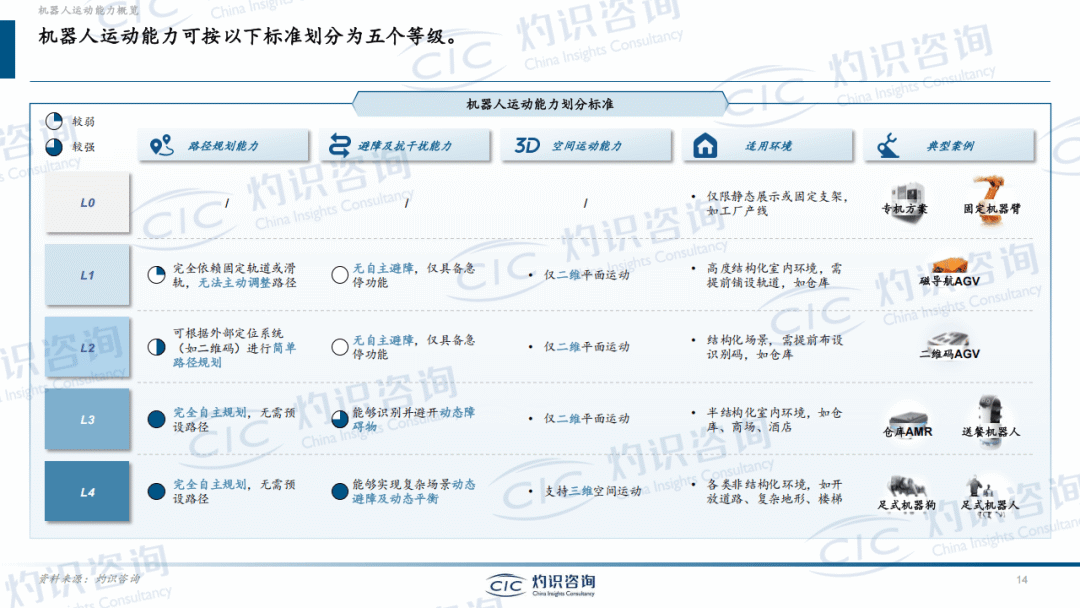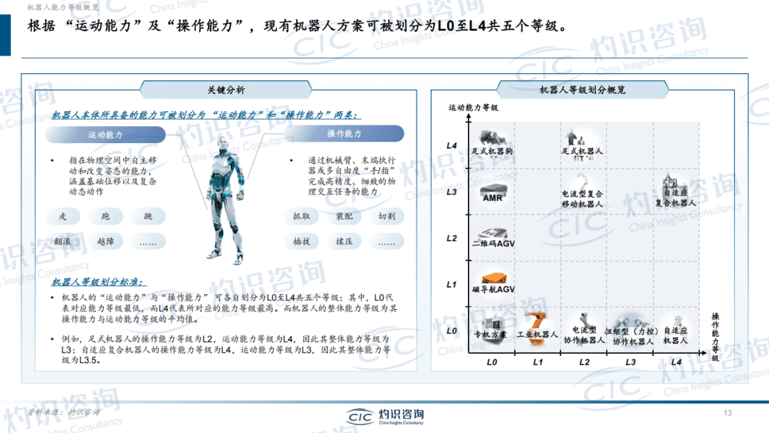 现有机器人方案存在明显局限,自适应机器人成为突破关键。机器人按运动能力和操作能力分为L0至L4五个等级,当前工业机器人、AMR等多处于L2-L3级别,存在任务泛化能力差、对结构化环境依赖度高、实时调整能力不足等问题,难以适应复杂多变的作业场景。而自适应机器人作为通用智能机器人的执行基座,具备L4级别的运动与操作能力,融合视觉识别、力控传感等技术,可在非结构化工况中自适应环境与任务变化,实现精细化操作、场景快速迁移和多任务切换,大幅降低部署门槛。