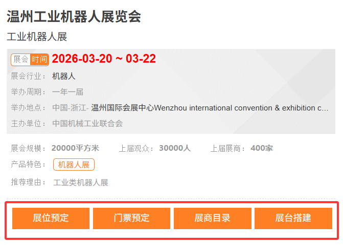 温州工业机器人展览会工业机器人展【展位预定、门票预定、展商目录、展台搭建、差旅行程、签证、翻译、物流运输、补贴申报】