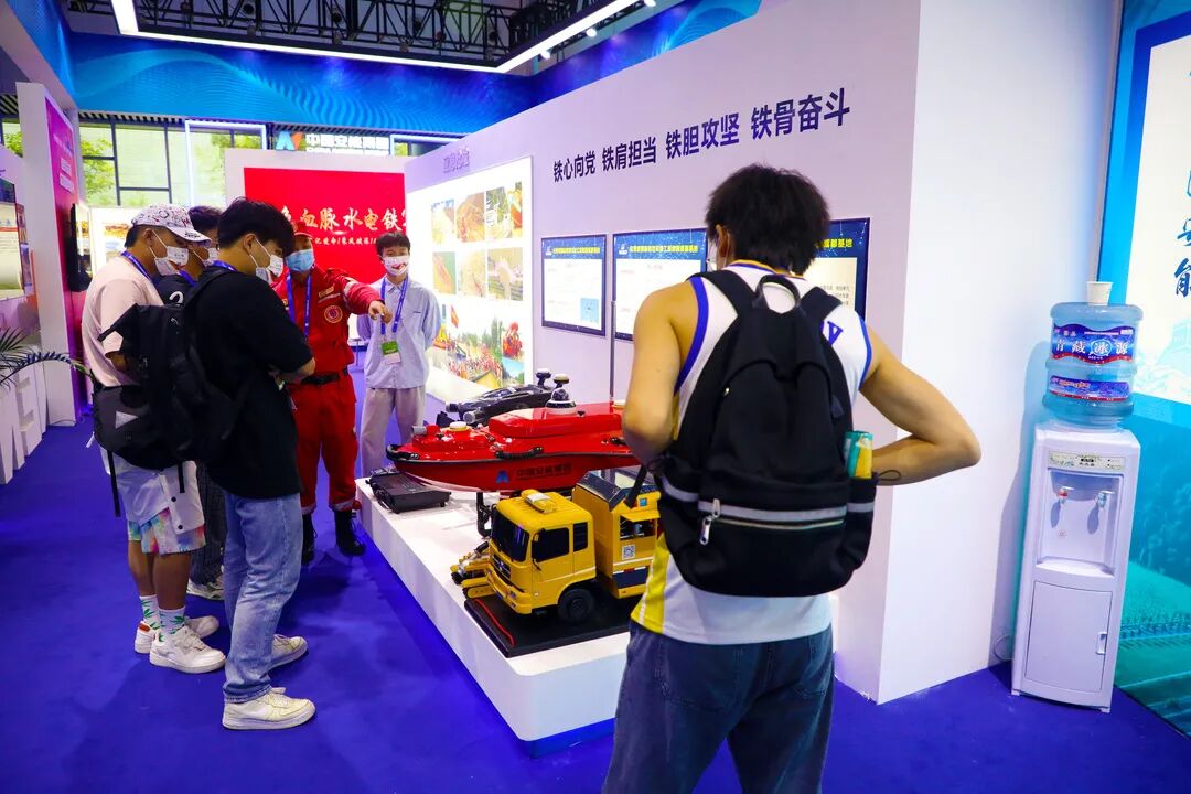 在应急救援板块展示区域,无论是应急救援大数据中心远程控制演示,还是制作精良的六旋翼侦查无人机、无人侦察船、子母式龙吸水3000等装备模型,都吸引了大量观众的互动交流,他们详细了解了应急装备的参数性能和使用场景,通过照片墙上一幅幅珍贵的图片重现,饶有兴致地倾听着中国安能遂行重大抢险战役中的担当作为,特别是了解到打通汶川地震第一条“生命通道”、成功处置唐家山堰塞湖以及每年都冲锋在国家重大自然灾害抢险的最前线,均是中国安能救援队时,在场观众竖起大拇指纷纷点赞,“你们真棒”“不愧是军转央企”,广大群众的交口称赞使全体参展人员备受鼓舞、倍感自豪。