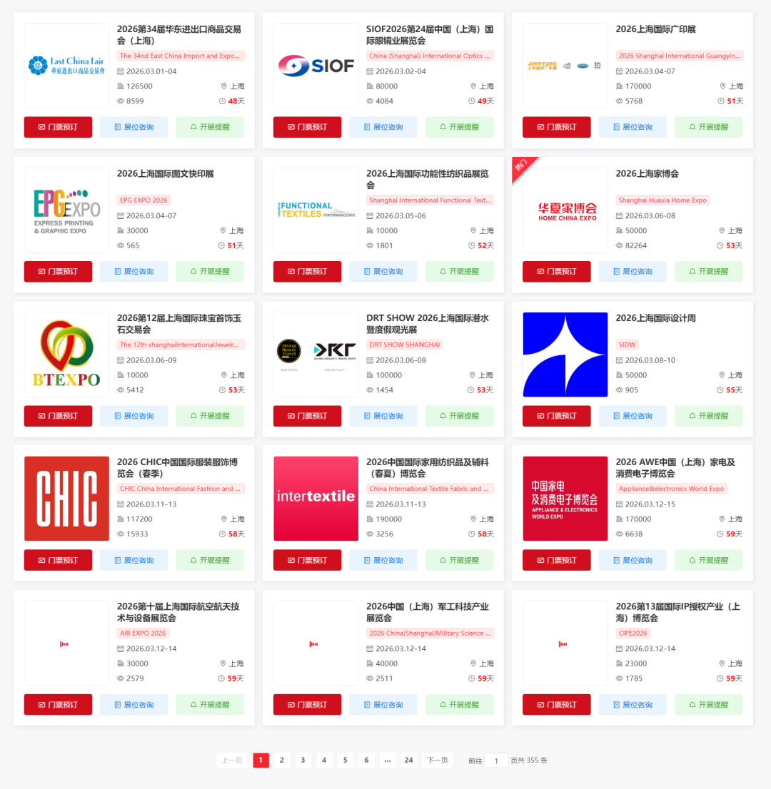 2026年4月上海展会将举办多场重要的展会活动,涵盖了餐饮、加盟、泳池桑拿、家具、酒店用品、清洁用品、制冷、劳保、啤酒、养老、健康、医疗用品、医疗器械、环保、奢侈品、化工、成人用品、塑胶、机床、物流、医药、军工、贸易、香精香料、工业、涂料展等;小编为大家整理了4月上海展会排期表,希望能帮助你规划行程。末文获取上海展会门票预约入口~(大多限时免费)下期将整理5月展会~
