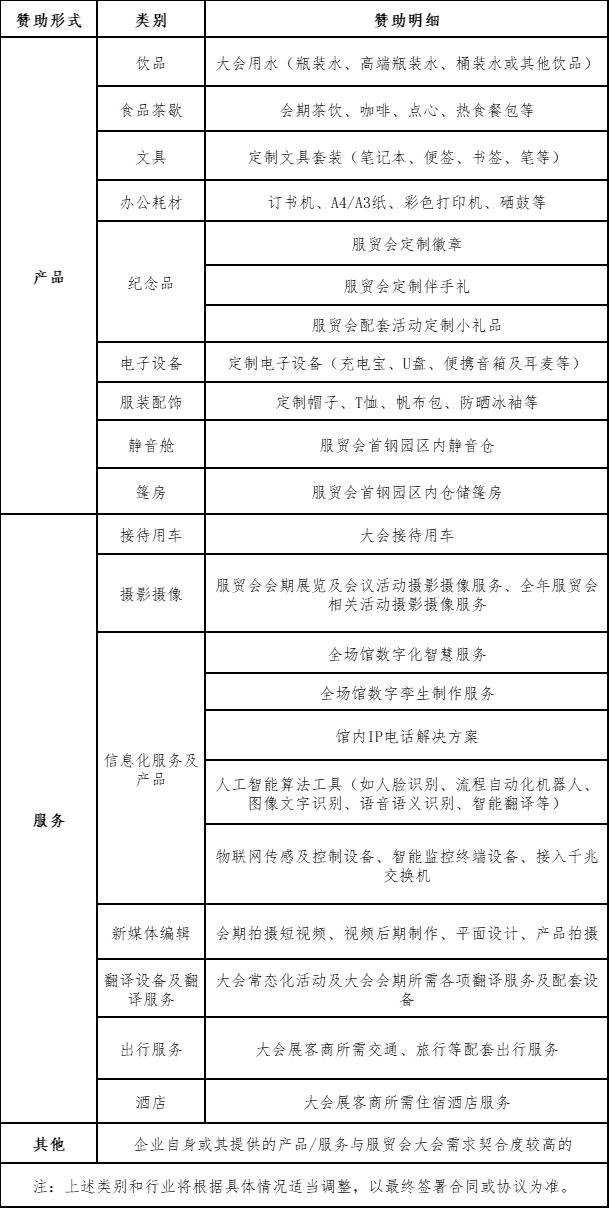 (一)应征人为服贸会提供价值不低于人民币20万元的赞助支持,服贸会所需产品及服务类别包括但不限于: