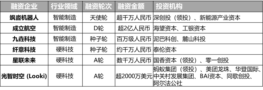 项目简介:飒沓机器人是一家新能源运维智能机器人研发商,专注于光伏电站、园林等场景的割草机器人产品,主打产品为MC700系列割草机器人,专为光伏电站、园林等场景设计。项目简介:成立航空是一家民营两机热端静止部件供应商,公司研制批产了燃油喷射系统、燃烧室其他部件及单元体,服务于国内航空发动机、燃气轮机领域。项目简介:九垚科技是一家硅碳新材料研发商,集产业化研发、生产、应用开发及销售于一体,以硅碳材料研发应用为核心,聚焦设计开发出硅碳新材料制动盘/片产品等,主要应用于新能源汽车、航空航天和风电摩擦制动等领域。项目简介:纤意科技是一家3D打印技术研发商,主要从事适用于大规模产业应用的多轴大尺寸连续纤维3D打印技术开发业务,已实现打印材料、设备及智能切片软件的完整交付。项目简介:星联未来是一家AI宠物硬件研发商,致力于将智能穿戴创新技术应用于宠物领域,重新定义真智能的宠物硬件产品,打造硬件+数据+生态的综合科学养宠解决方案。3.光智时空Looki完成USD2000万A轮融资投资方:BAI资本、中关村发展集团、华登国际、同歌创投、美团龙珠、蚂蚁集团、阿尔法公社项目简介:光智时空Looki是一家AI可穿戴设备研发商,专注于打造智能消费电子产品,旗下拥有首款多模态AI穿戴设备Looki L1,主推故事模式智能化间隔拍摄,支持12小时续航。在此,厚福资本再次恭喜以上获得融资的企业,未来业绩长虹,行稳致远,不断通过科技创新助力中国实体经济的高质量发展。