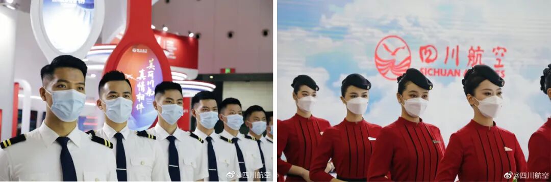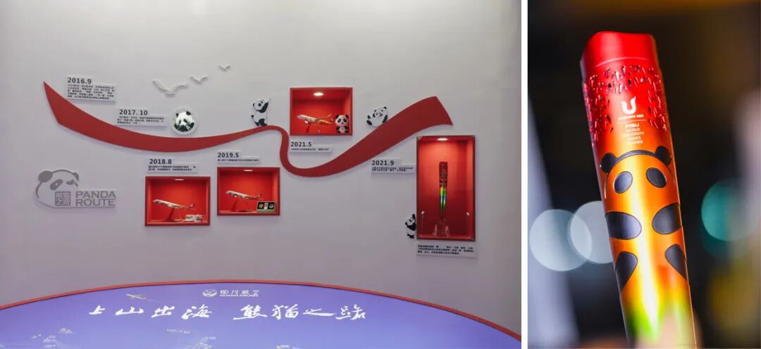 成都大运会火炬“蓉火”亮相西博会,与“大运号”主题彩绘飞机模型一起陈列于四川航空展馆,在川航数十位帅气机长和美丽空姐的“护航”下,首次与公众近距离见面。