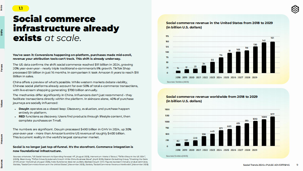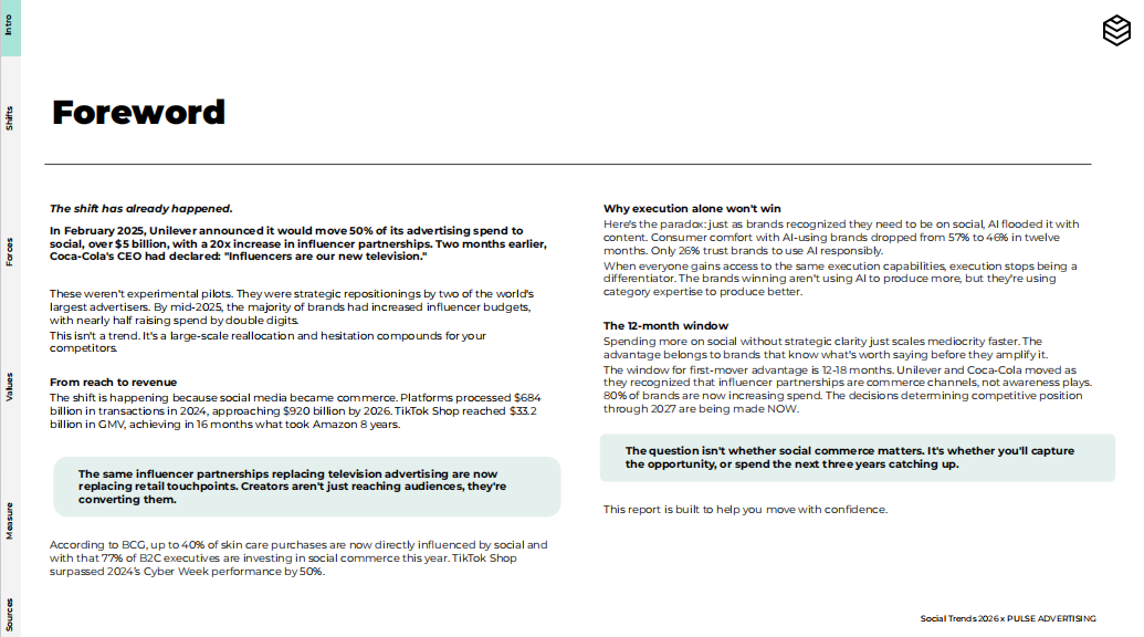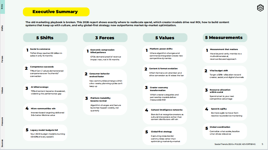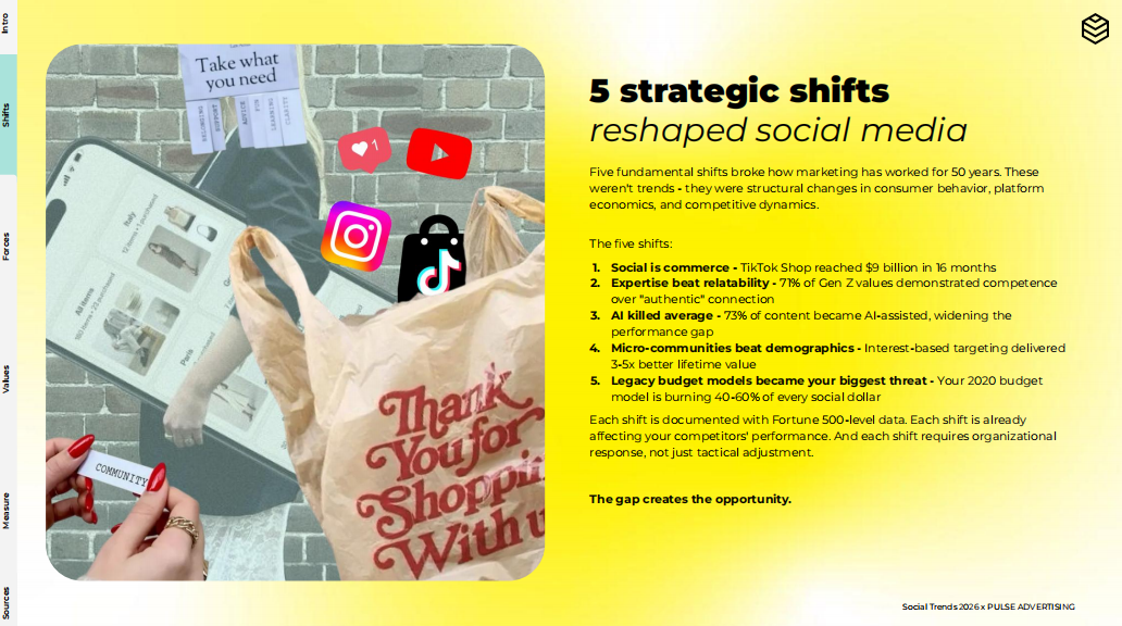 报告核心呈现五大战略转变:一是社交即商业,TikTok Shop 等平台实现爆发式增长,16 个月达成亚马逊 8 年的销售规模,2024 年全球社交 commerce 交易额达 6840 亿美元,2026 年预计逼近 9200 亿美元;二是专业度胜过分身感,71% 的 Z 世代更看重品牌专业能力,信任与专业度直接关联购买决策;三是 AI 终结平庸,73% 内容由 AI 辅助生成,但仅 5% 企业能通过战略引导实现差异化价值;四是微型社区取代人口统计定位,兴趣导向的精准 targeting 带来 3-5 倍更高客户终身价值;五是传统预算模型成阻碍,2020 年预算结构导致 40%-60% 社媒投入浪费,需转向社区优先的资源分配。