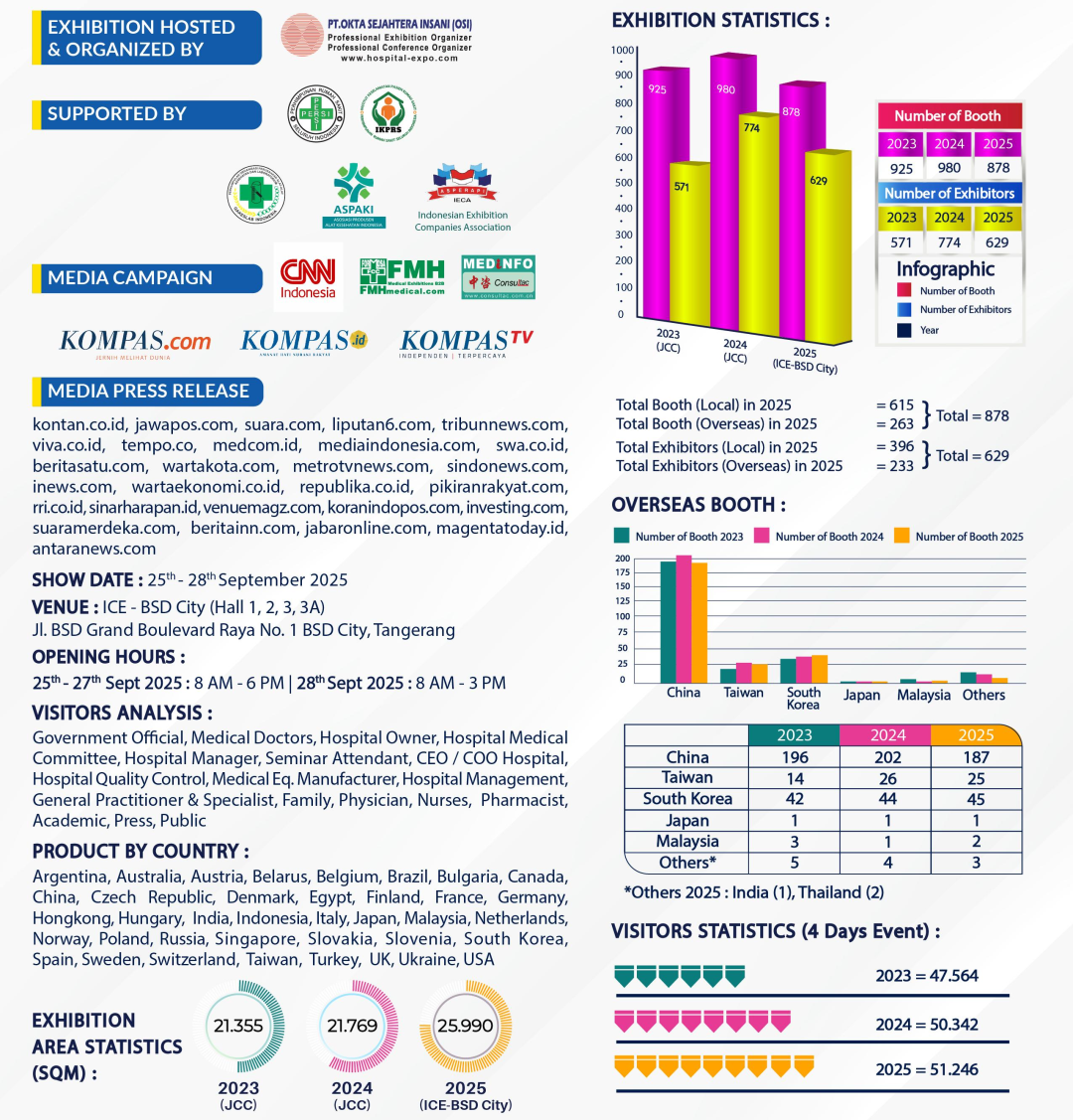 Hospital Expo是印度尼西亚最专业、最具影响力的医疗行业展,由印度尼西亚国家展览协会成员OSI公司联合印度尼西亚医疗行业协会、雅加达医疗行业协会承办,展出内容类别齐全,参展商和专业观众质量高,是印尼影响力的医疗展会。展会37年历史,成为东南亚规模第一大展,为业内供应商及采购商与国际医疗制造企业的专业合作平台。